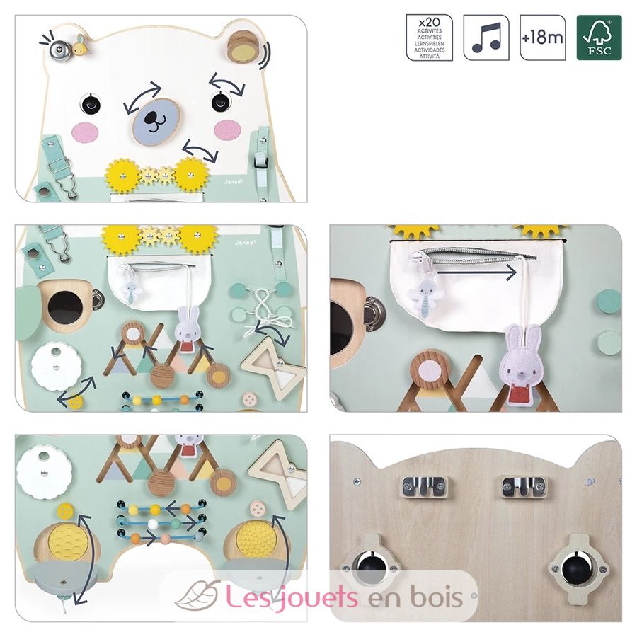 Muchos placeres táctiles y acústicos para desarrollar la motricidad fina del bebé. Y una serie de aberturas accesibles, perfectas para practicar el vestido. Es un juguete versátil, completo y perfecto para el juego independiente. El tablero de madera puede fijarse fácilmente a la pared. Con su estilo poético y sus bonitos colores, quedará genial en la habitación de cualquier niño.