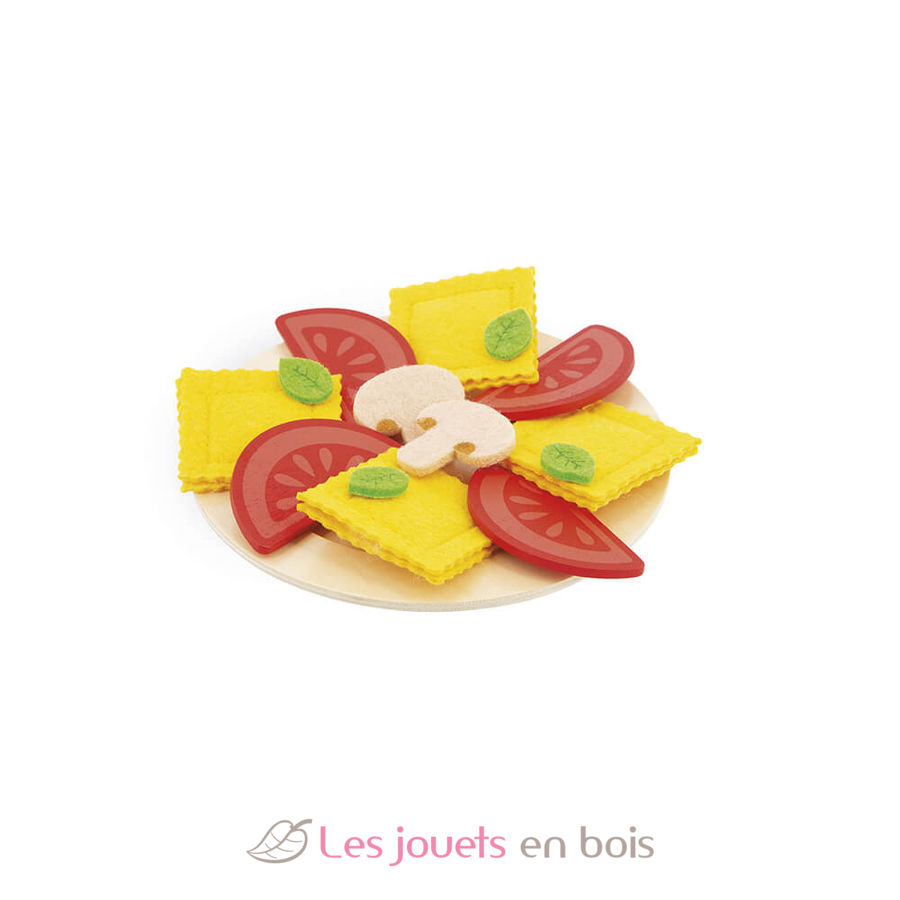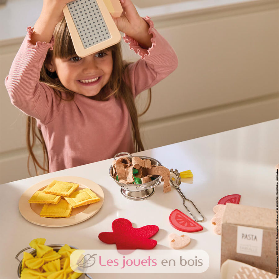 Viaje culinario garantizado con este set de pasta compuesto por 58 accesorios de madera y fieltro : 20 farfalle como las de verdad, 4 raviolis grandes, 6 hojas de albahaca, 5 champiñones y 1 salsa de tomate, todo de fieltro. ¡Los 10 tallarines están hechos de cinta plana imitando perfectamente el color de esta excelente pasta! Para decorar los platos de los minicocineros, nada mejor que el parmesano, su rallador y unos tomates de madera. Todo se sirve en un plato con la cuchara, el colador y la cacerola de metal incluidos. ¡Práctico, la pasta se guarda fácilmente en los dos bonitos paquetes de cartón!
