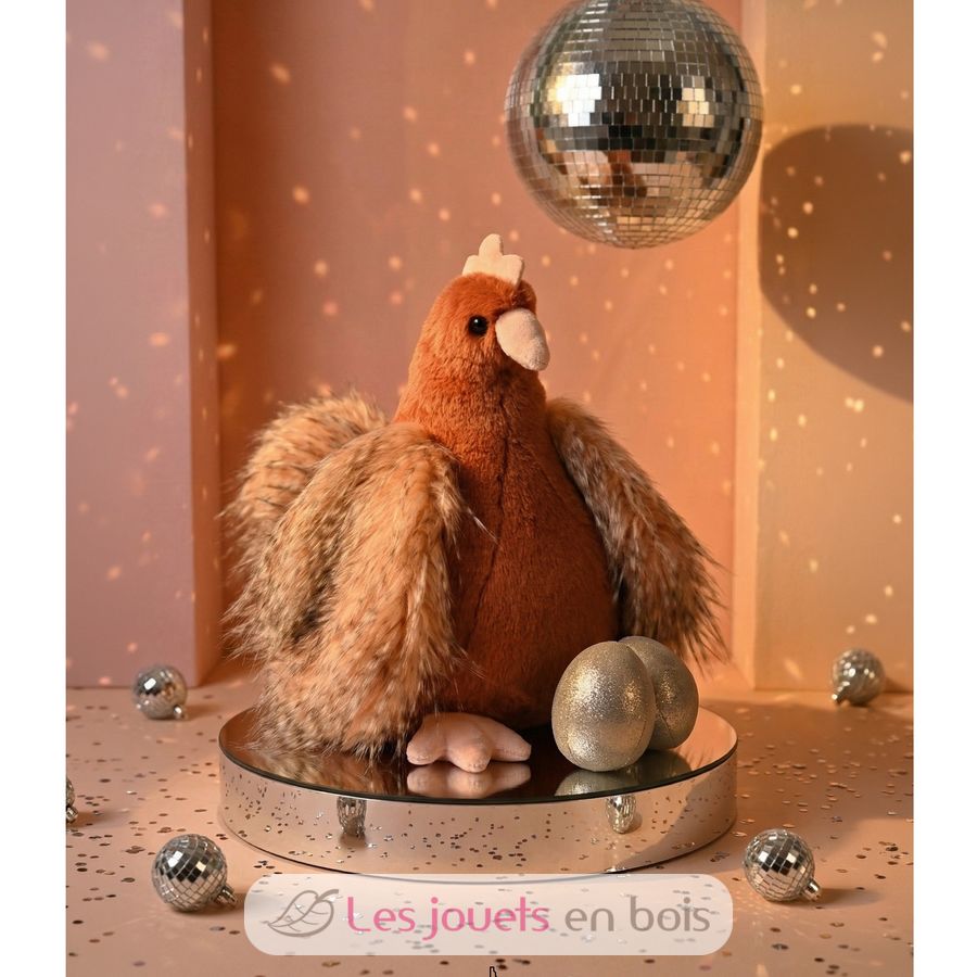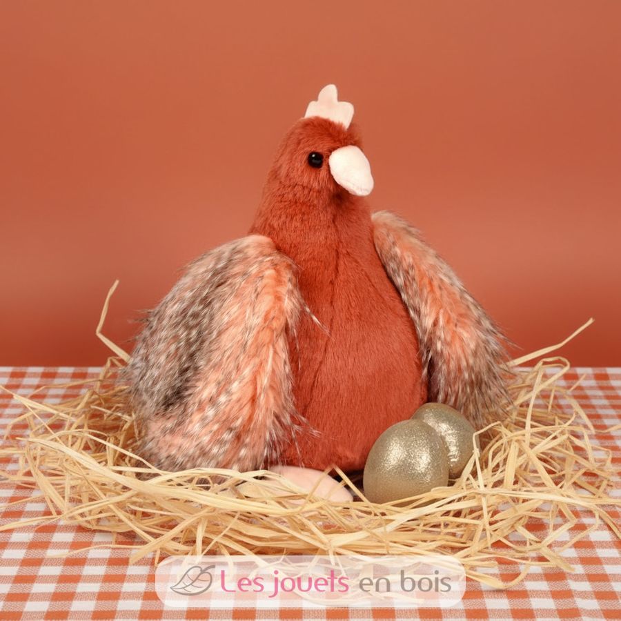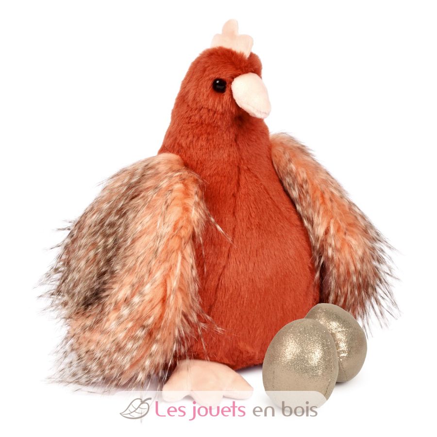 Gallina de peluche 28 cm, un peluche de Histoire d'Ours. Incluye dos huevos dorados que puede esconder en su vientre.