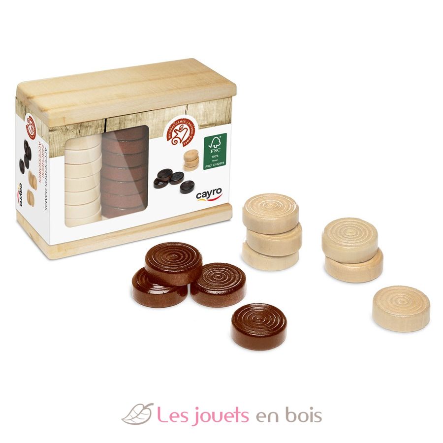 Caja que contiene 24 piezas de damas con un diámetro de 2,5 cm y un grosor de 0,8 cm. Estas piezas de damas están hechas de madera con un acabado de barniz mate.