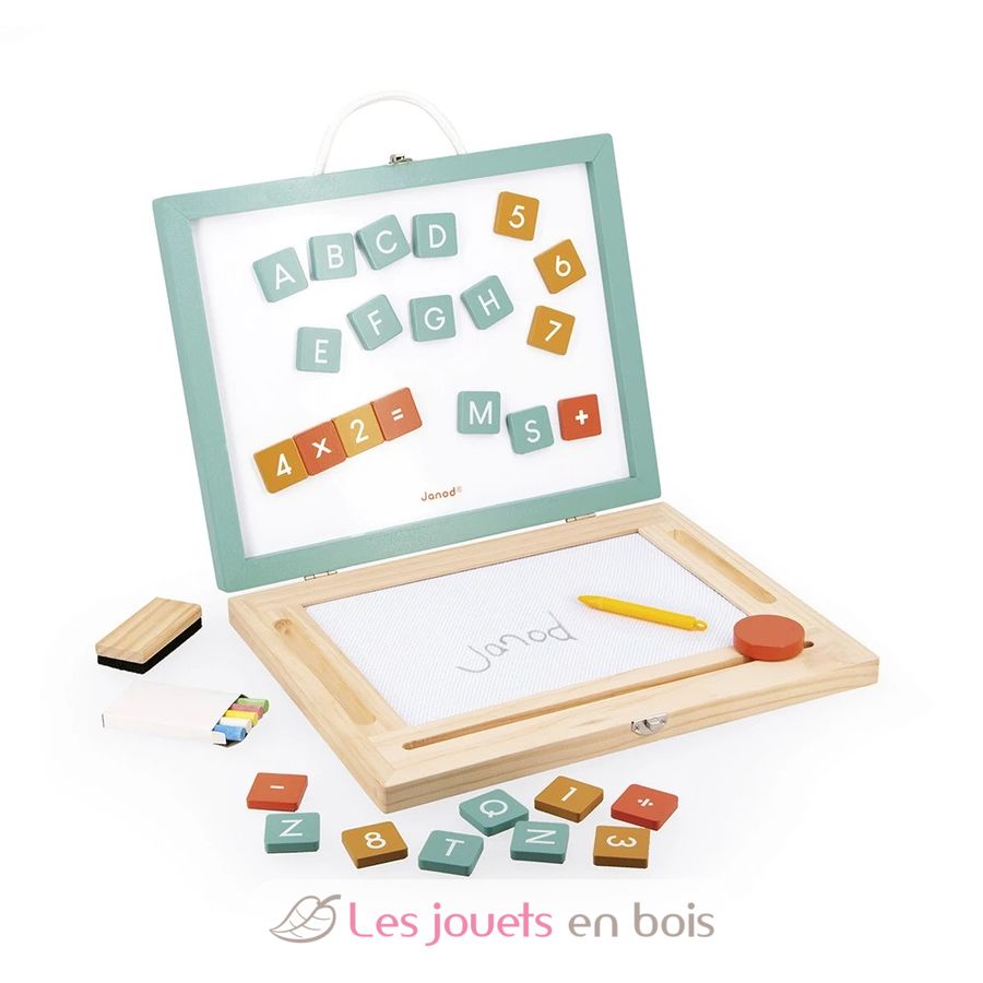 Este bonito estuche de madera contiene 4 actividades: en primer lugar, 1 pizarra mágica con su lápiz óptico. Basta con deslizar el mango de izquierda a derecha para borrar el dibujo como por arte de magia. Después, 1 pizarra magnética blanca con 42 imanes (27 letras, 10 números y 5 signos) para aprender el abecedario, escribir sus primeras palabras o realizar sus primeras operaciones. Junto a ésta, encontrará también 1 pizarra negra, con su caja de tizas y su pincel. Por último, 1 cara blanca ideal para escribir y dibujar con un rotulador de borrado en seco (no suministrado).