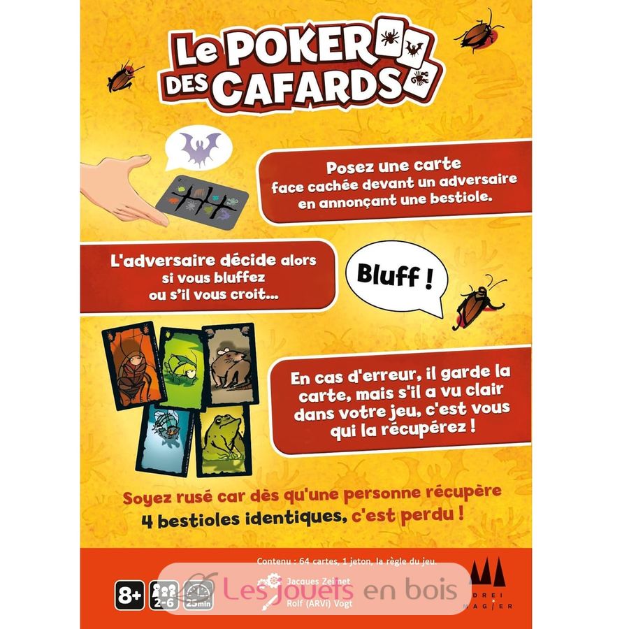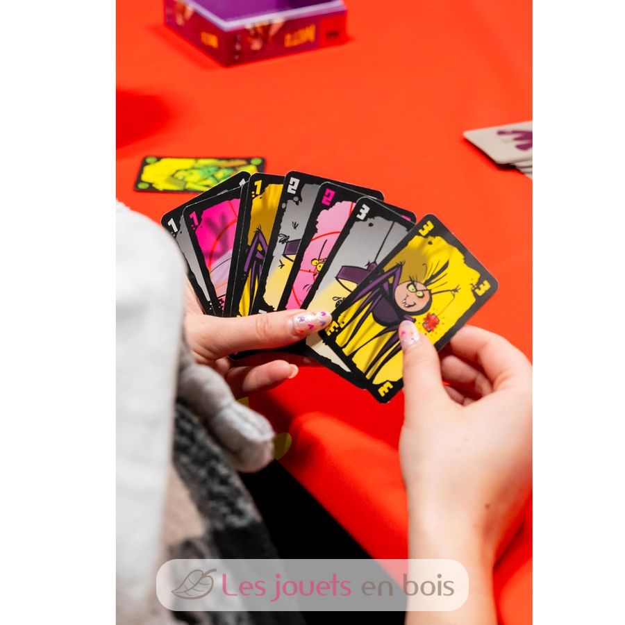 Las tarjetas representan diferentes tipos de bichos muy simpáticos (murciélago, cucaracha, sapo, escorpión...). Uno de los jugadores coloca una carta boca abajo delante de él y anuncia un animal a un jugador que debe decidir si cree que el jugador miente o no. Si el jugador acierta, el jugador que ha presentado la carta la vuelve a coger y la coloca boca arriba delante de él. Si se equivoca, se lo lleva por delante. El primer jugador que tenga 4 animales de la misma especie pierde. También puedes decidir pasar la carta a otro jugador.