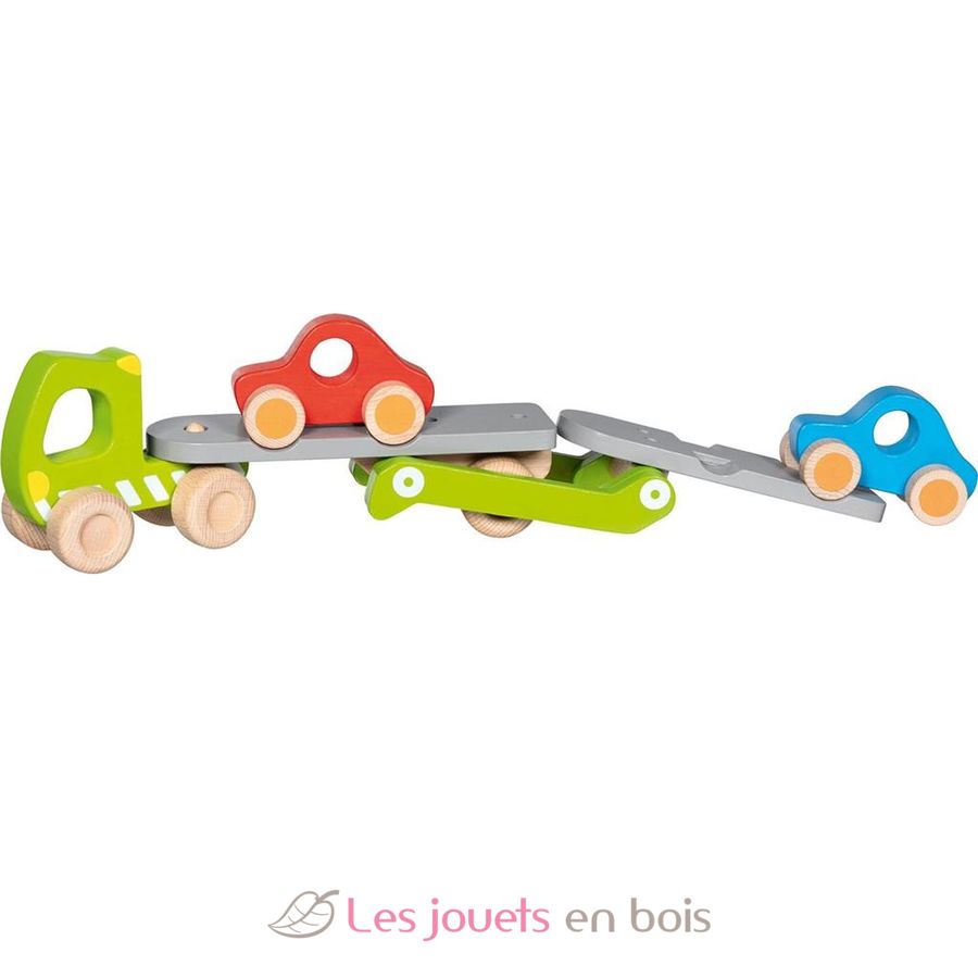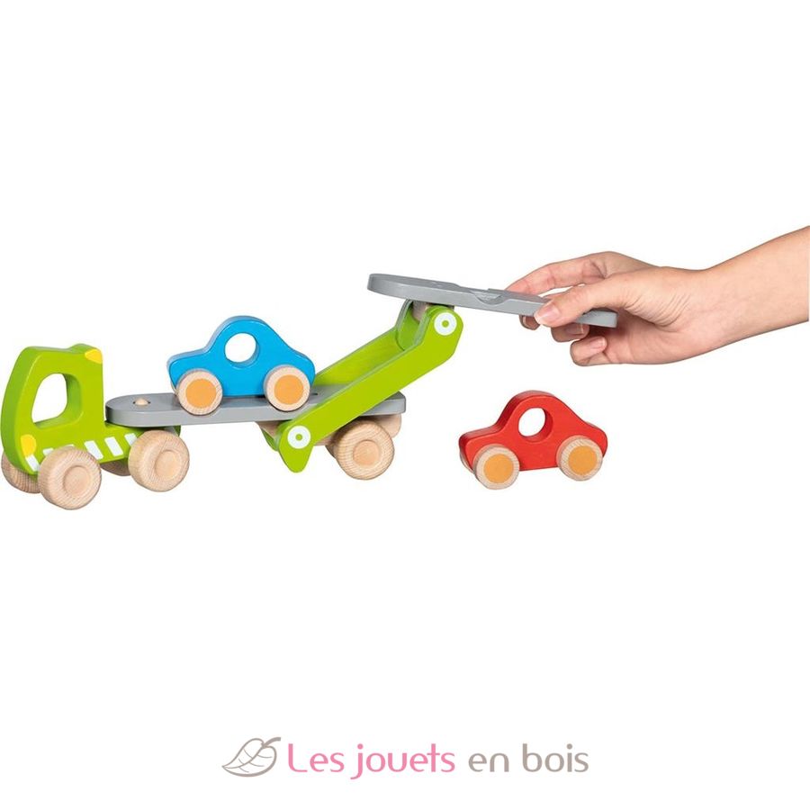 Con este camión transportacoches de madera, los niños no solo pueden conducir, sino también practicar la carga y descarga.