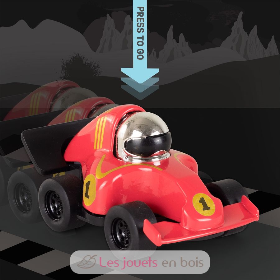 ¡Este mini coche de carreras retro, rápido y sin pilas, está listo para rodar! Los niños se lo pasarán en grande compitiendo con estos ágiles coches de metal fundido. ¡Activa el mecanismo de carreras con solo presionarlo y listo!
