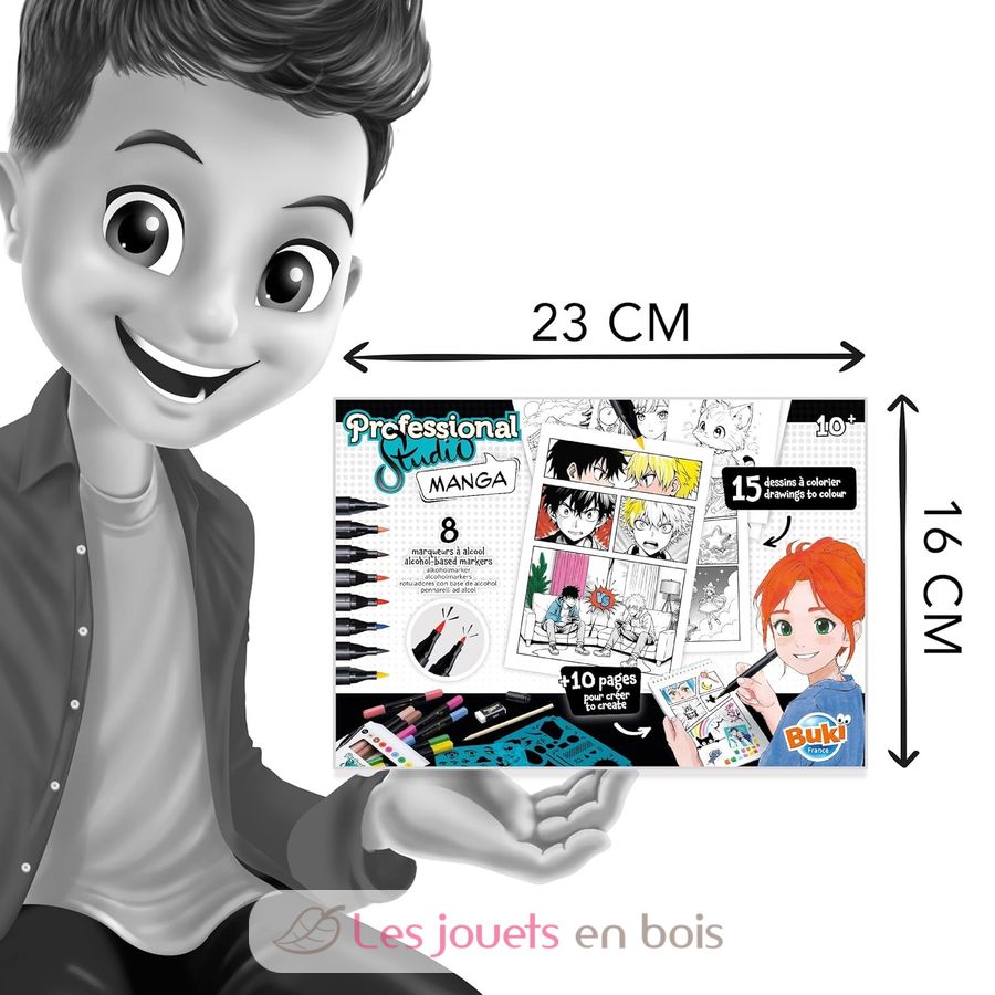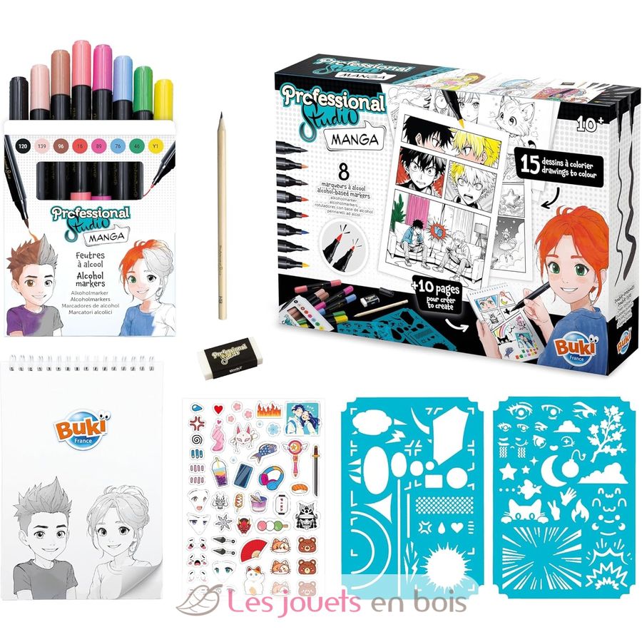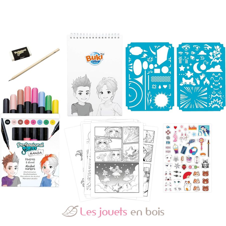La caja Professional Studio Manga contiene: un cuaderno A5 con 25 hojas desprendibles incluyendo 15 manga para colorear y 10 hojas en blanco, 8 rotuladores de alcohol, 1 lápiz, una goma de borrar, dos hojas de plantillas y una hoja de pegatinas.