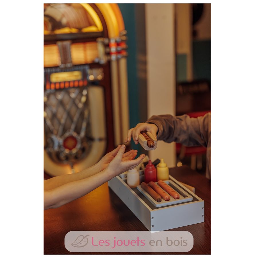 Este puesto de perros calientes de madera es el complemento ideal para la colección de juguetes de comida de juguete de los niños. Fomenta el pensamiento imaginativo, la motricidad fina y el desarrollo social, a la vez que proporciona una experiencia divertida y realista.