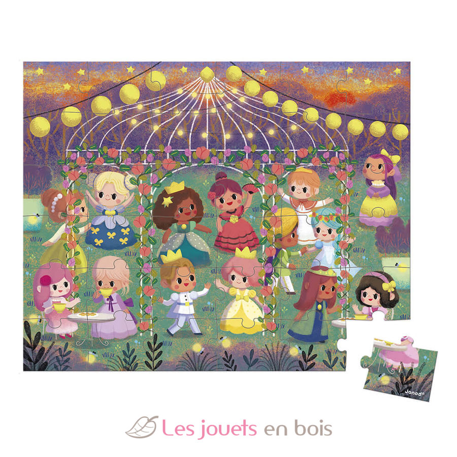 ¡Príncipes y princesas organizan una pequeña recepción, a la que tu hijo está invitado! Reúnete con las princesas para bailar bajo la luna con este puzle de cartón de 36 piezas. Una divertida ayuda para desarrollar la destreza y la memoria de los niños.