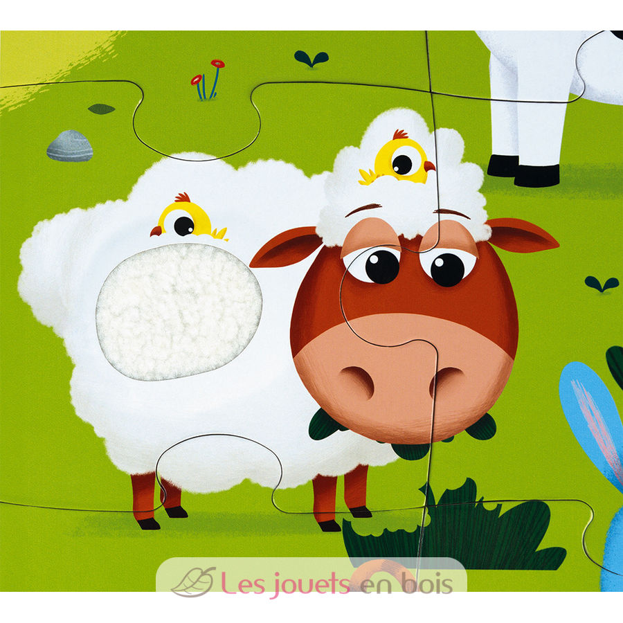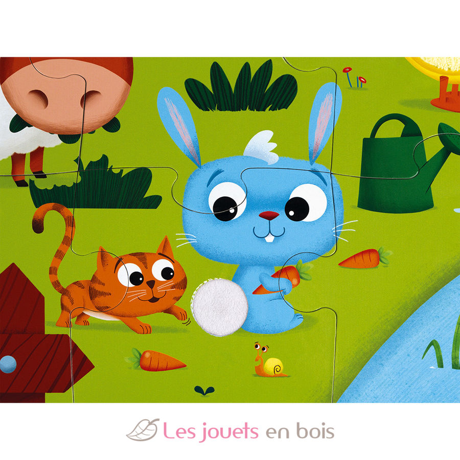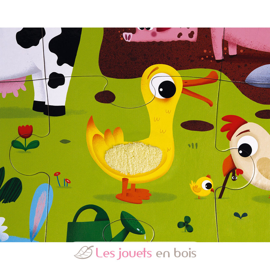 ¡Conozcamos a los animales de la granja a través de un puzle de 20 piezas para niños a partir de 2 años! ¿Qué tiene de especial? ¡Que es táctil! ¡Qué alegría tocar el suave pelo de la vaca, de la oveja, imitación de la cola del conejo, cerdo, pato, cresta del gallo o rana una vez terminado el puzle! ¡El niño acariciará y descubrirá esos divertidos materiales para desarrollar tu sentido del tacto! Las bonitas ilustraciones de este puzle gigante de alegres colores le sumergirán en un mundo exótico con divertidos detalles.