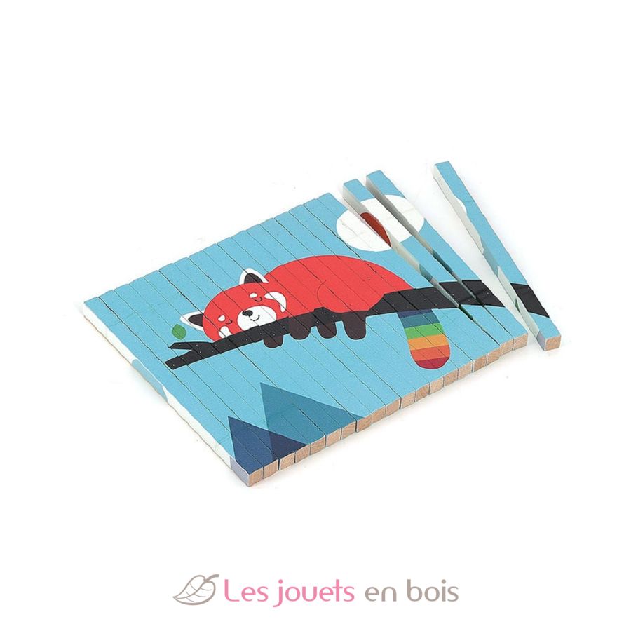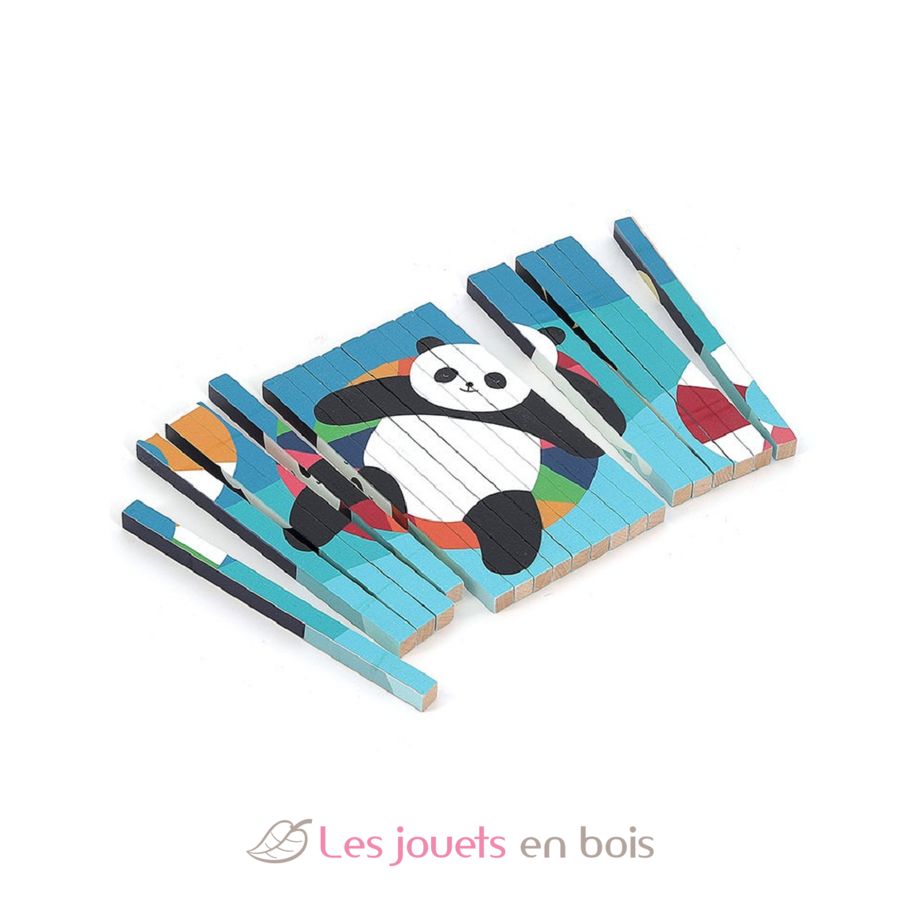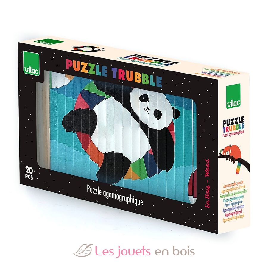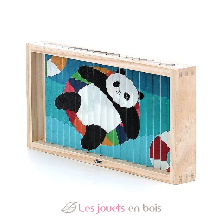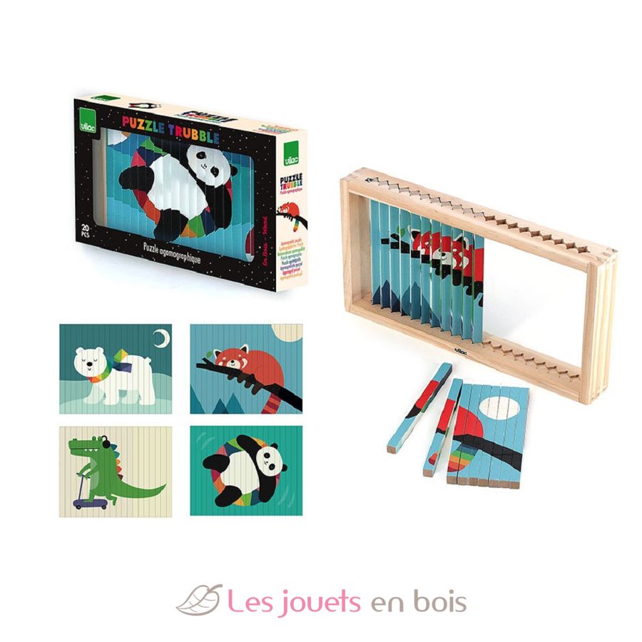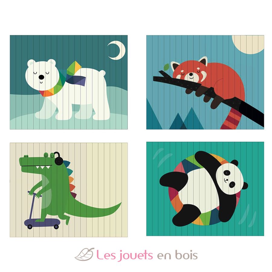 Si me inclino hacia la izquierda, veo un panda rojo. Si me inclino hacia la derecha, descubro un oso polar. En total, se revelan 4 ilustraciones diferentes (oso polar, panda rojo, cocodrilo, panda) con este puzzle de 4 dimensiones.