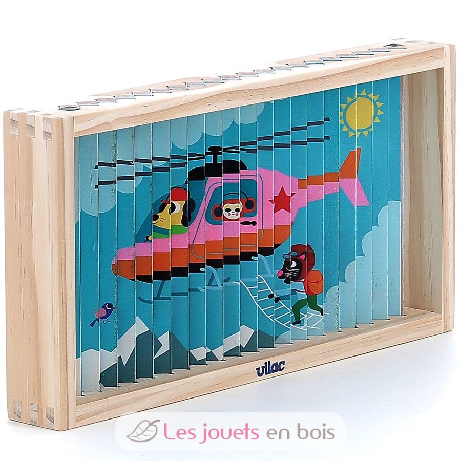 Si te inclinas hacia la izquierda, verás un helicóptero. Si te inclinas hacia la derecha, verás un barco. En total, verás 4 ilustraciones diferentes (helicóptero, barco, tren y coche) con este puzzle de 4 dimensiones.
