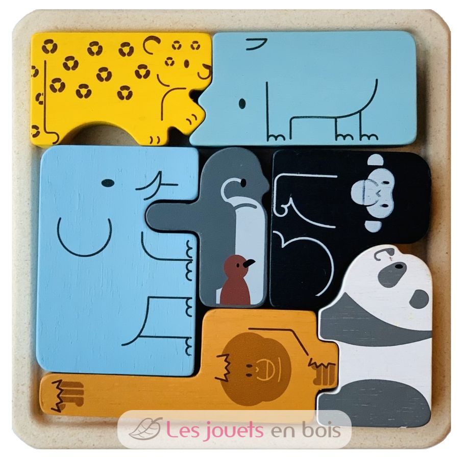 Este puzzle de madera de animales incluye un elefante, un rinoceronte, un pingüino, un gorila, un orangután, un panda y un leopardo.