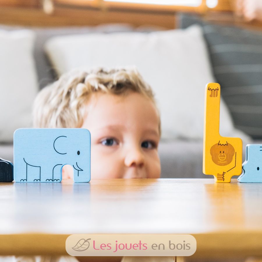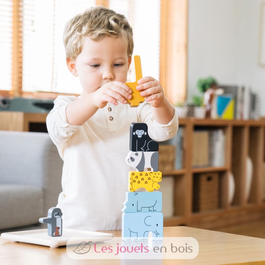 ¡Ayuda a los animales a encontrar su lugar en el tablero de madera o apílalos para derribarlos!
