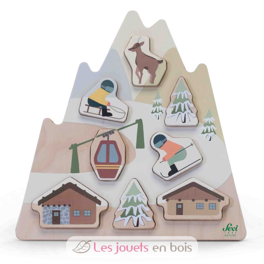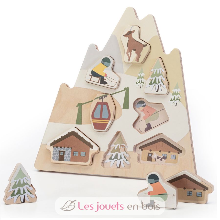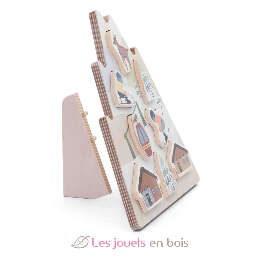 Este puzzle de encajes de madera consta de 8 piezas y un tablero en forma de montaña, inspirado en los Dolomitas (Italia). Gracias al pie extraíble es posible jugar tanto en posición horizontal como vertical.
