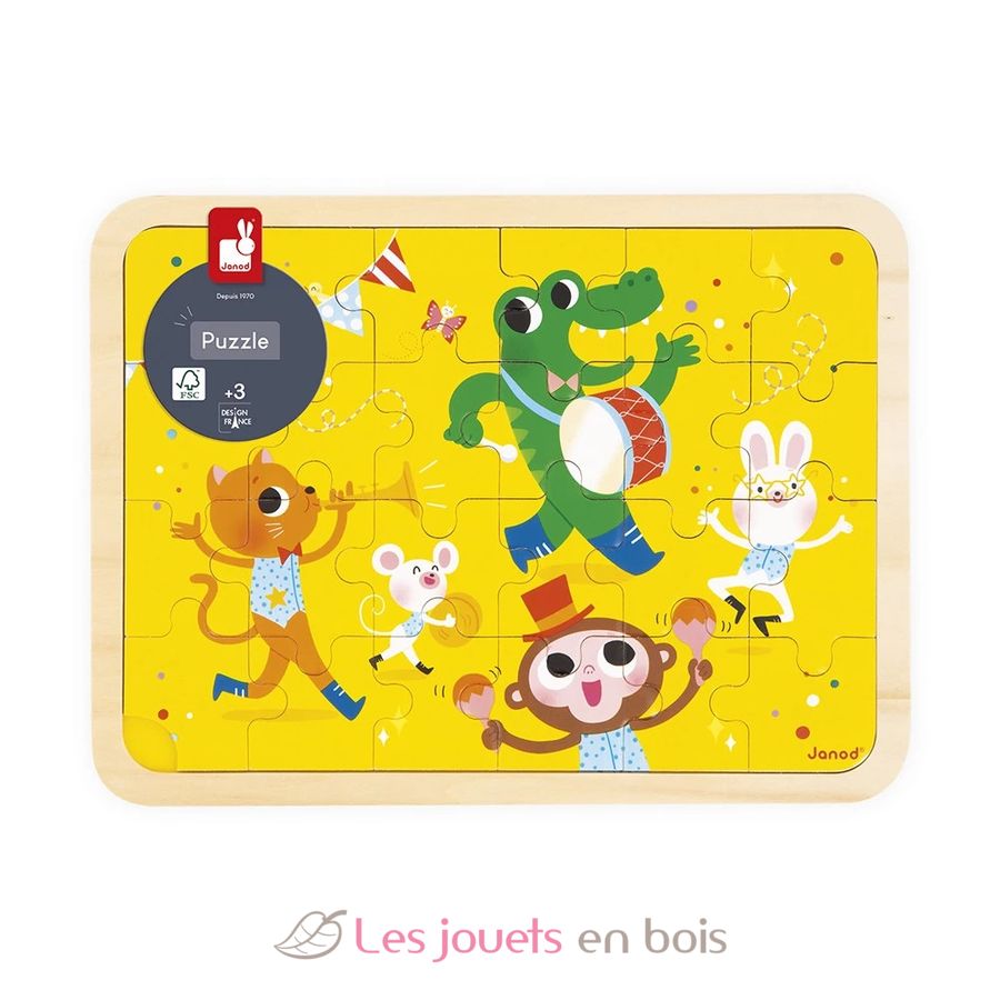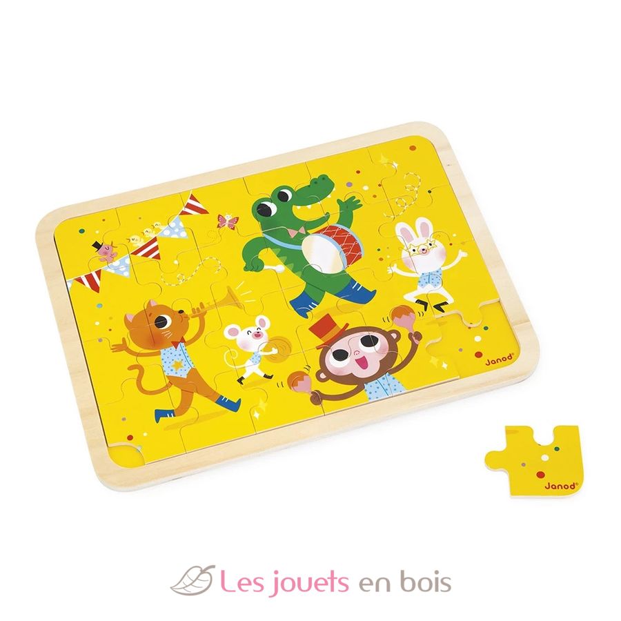 Puzzle de madera Viva la fiesta 24 piezas, un puzzle fabricado por Janod. Número de artículo J07125.
