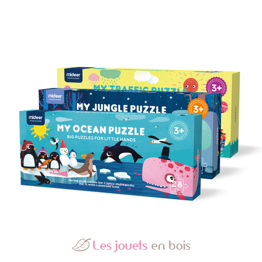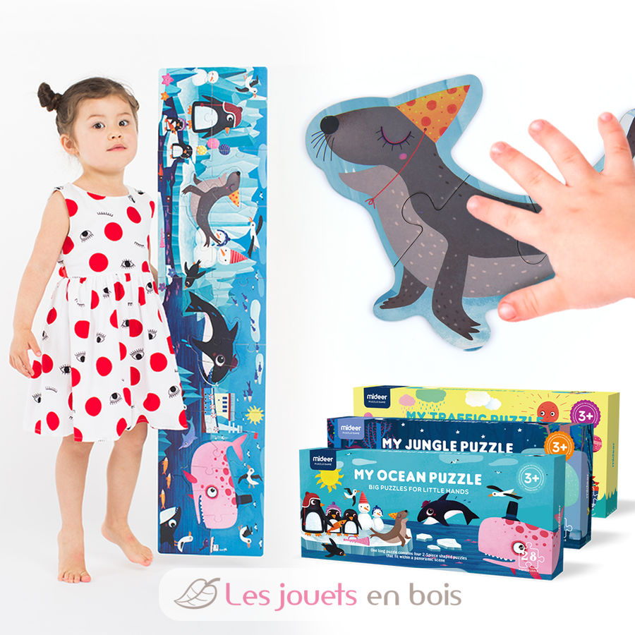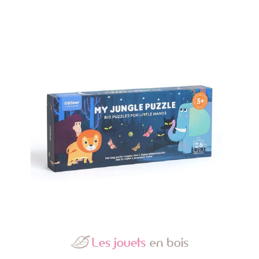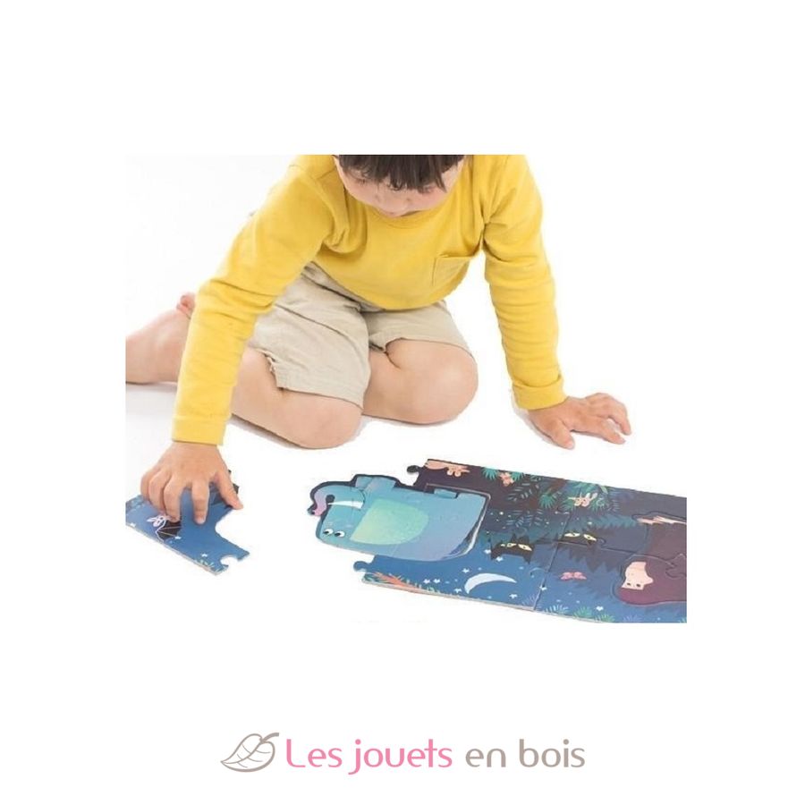 Puzzle de suelo grande de 1 metro de largo por 22 cm de ancho, compuesto por 28 piezas de cartón. Además de una hermosa escena panorámica, este puzzle gigante contiene 4 pequeños puzzles progresivos de 2, 3, 4 y 5 piezas. Así, el niño podrá divertirse reproduciendo el contorno de cada uno de los pequeños rompecabezas con forma de animal en una hoja de papel.