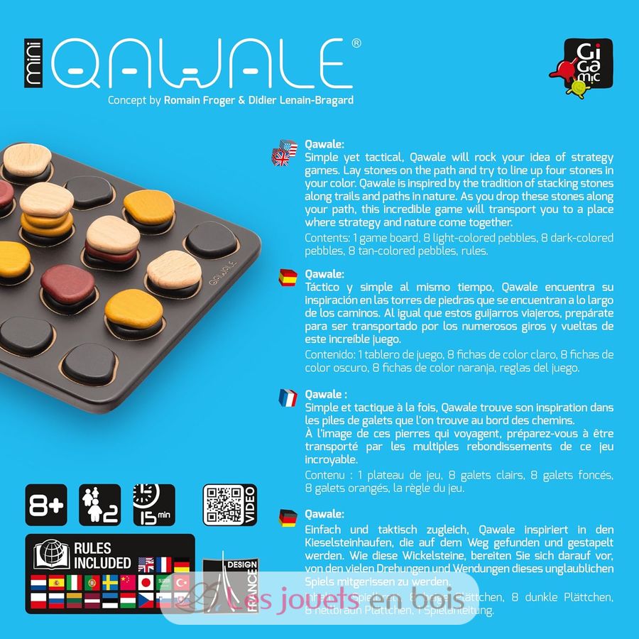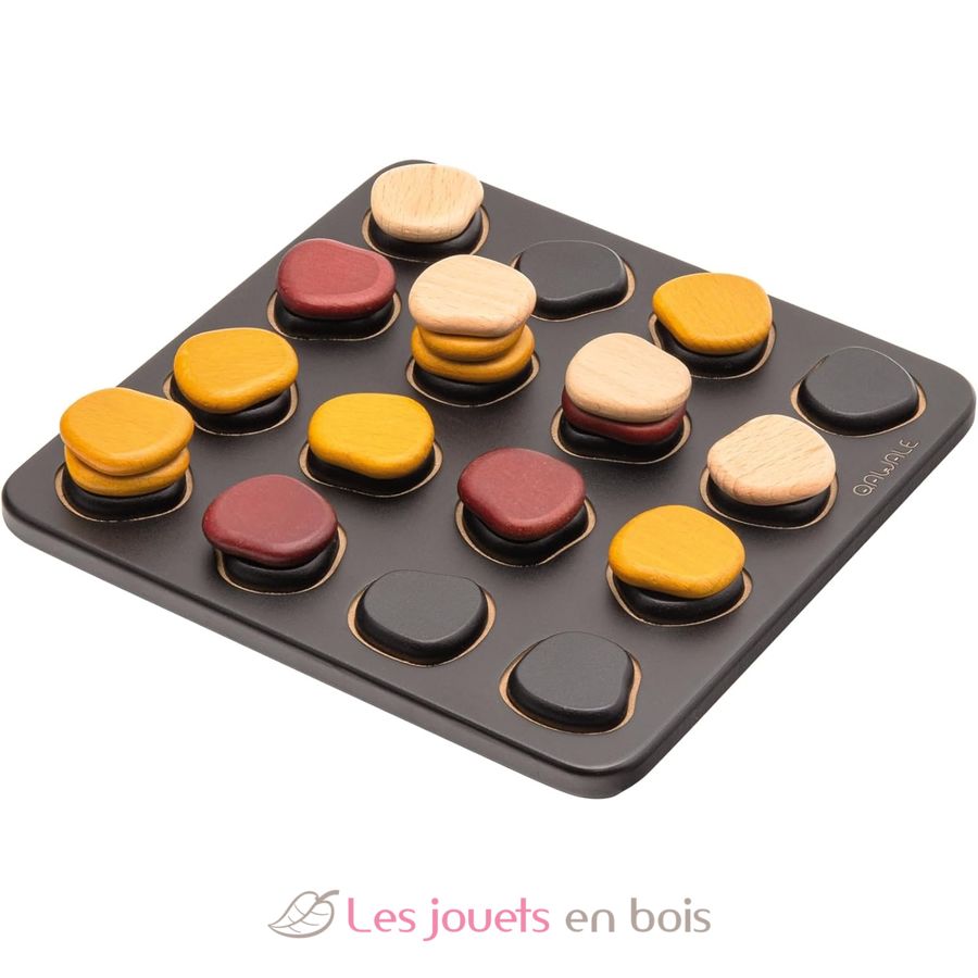 Simple y táctico al mismo tiempo, Qawale encuentra su inspiración en los montones de guijarros que se encuentran a lo largo de los caminos. Como estas piedras que viajan, coloca un guijarro encima de un montón antes de desgranarlo en las casillas del tablero. Forma una línea de 4 guijarros de tu color para ganar el juego.