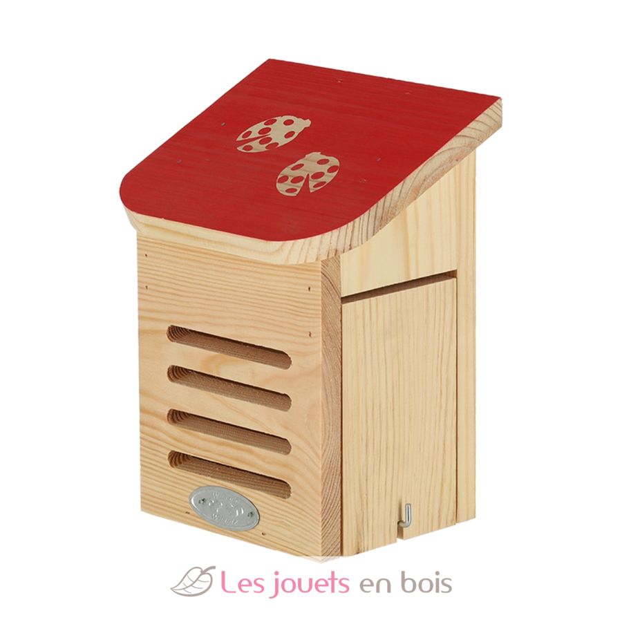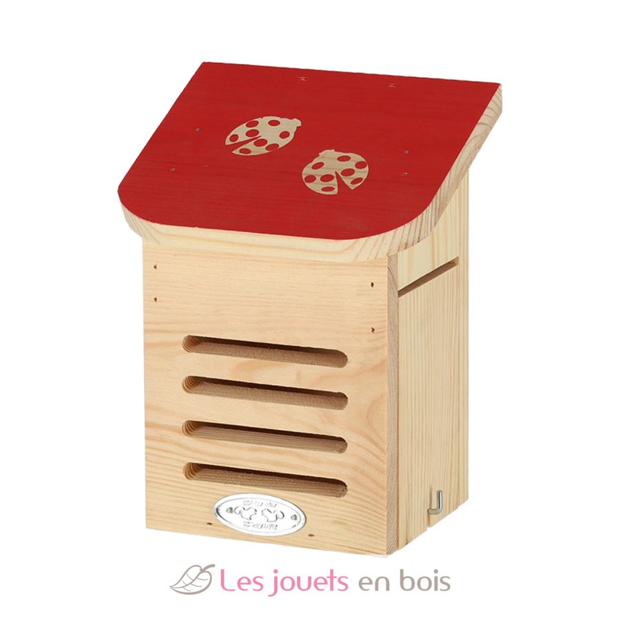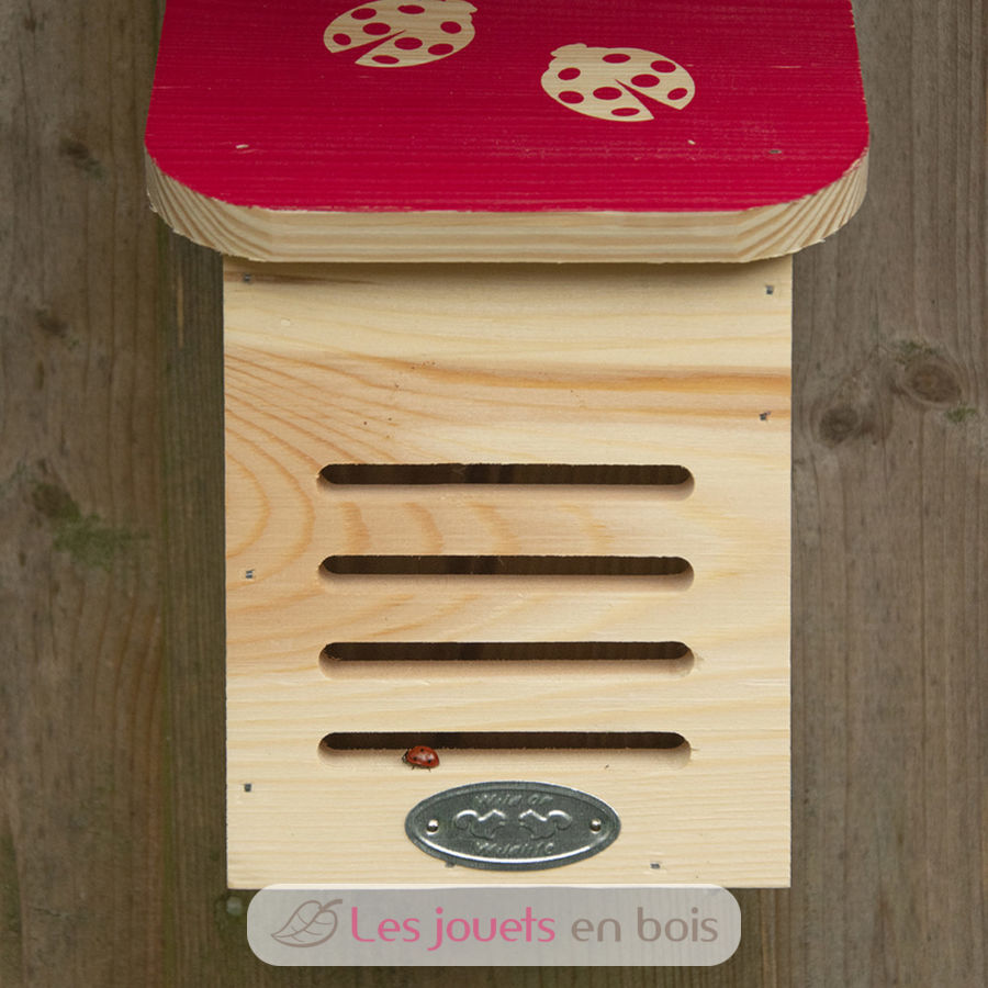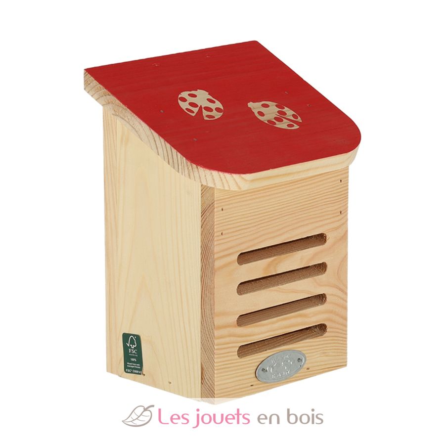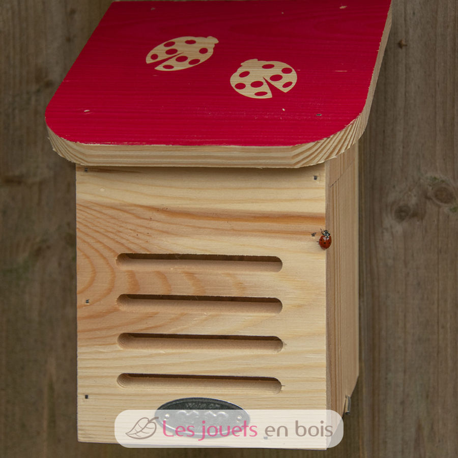 Refugio para mariquitas fabricado en madera de pino con certificación FSC, con un techo de colores brillantes decorado con una silueta de plantilla.
