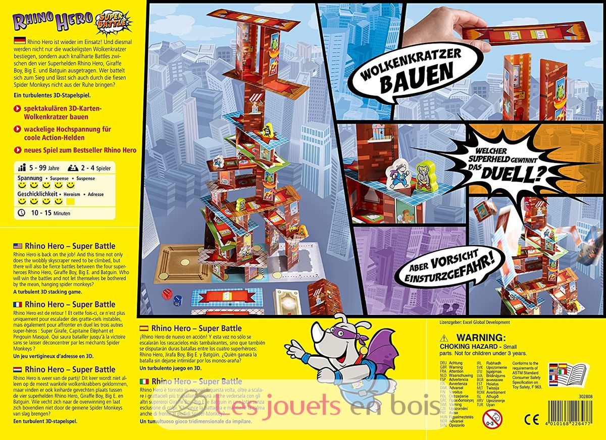 ¡Vuelve Rhino Hero! Y esta vez no se trata sólo de escalar rascacielos inestables, sino también de batirse en duelo con los otros tres superhéroes: Súper Jirafa, Capitán Elefante y Pingüino Enmascarado. ¿Quién será capaz de luchar hasta la victoria sin distraerse con los malvados monos araña?