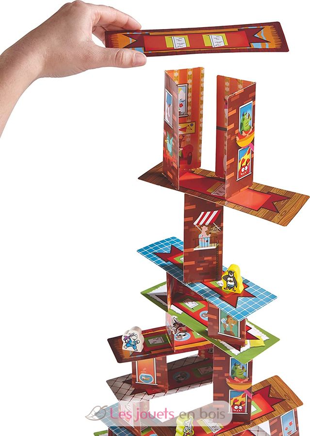 Contenido: 1 tablero de juego (3 losetas cuadradas impresas en cada cara), 30 pisos, 24 paredes bajas, 24 paredes altas, 3 dados (rojo/azul/azul claro), 4 monos araña, 4 superhéroes (Héroe rinoceronte, Superjirafa, Capitán elefante y Pingüino enmascarado), 1 medalla de mejor escalador, 1 regla de juego.