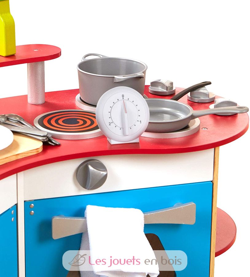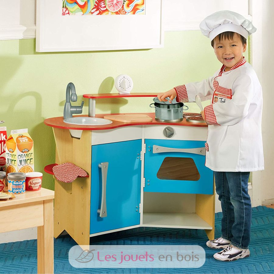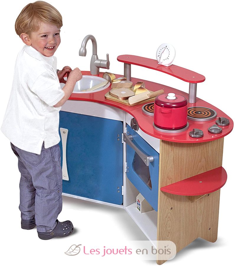 Un fregadero extraíble, una placa de cocción de tres fuegos, un horno con mandos de clic, un frigorífico, estantes de almacenamiento, una tabla de cortar y un verdadero temporizador funcional. Todo lo que un joven chef necesita está incluido en esta compacta y eficiente cocina de madera!