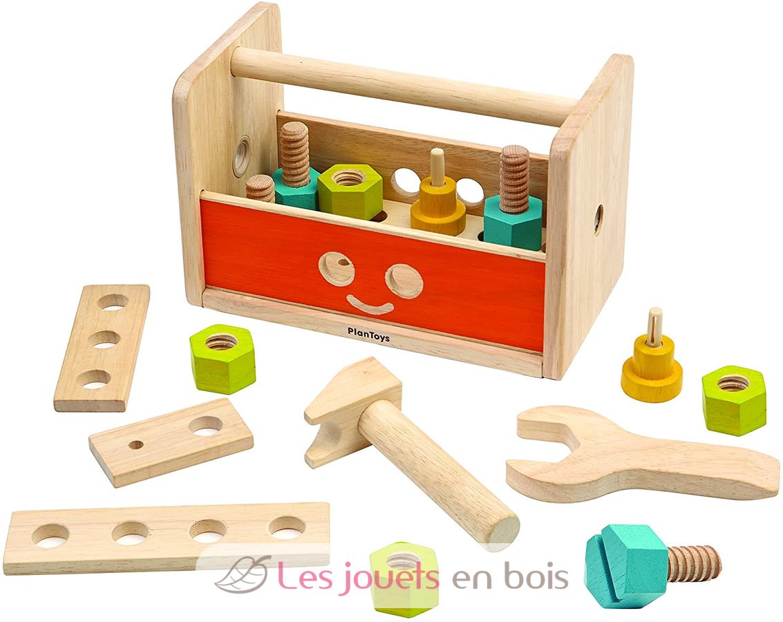 ¡Hermosa caja de herramientas que se convierte en un banco de trabajo o en un robot! Tu pequeño manitas también podrá construir cosas increíbles gracias a las 10 herramientas que lo componen: martillo, llave inglesa con punta de destornillador, tornillos, tuercas,... Un juguete de madera de la marca Plan Toys - ref PT5540.
