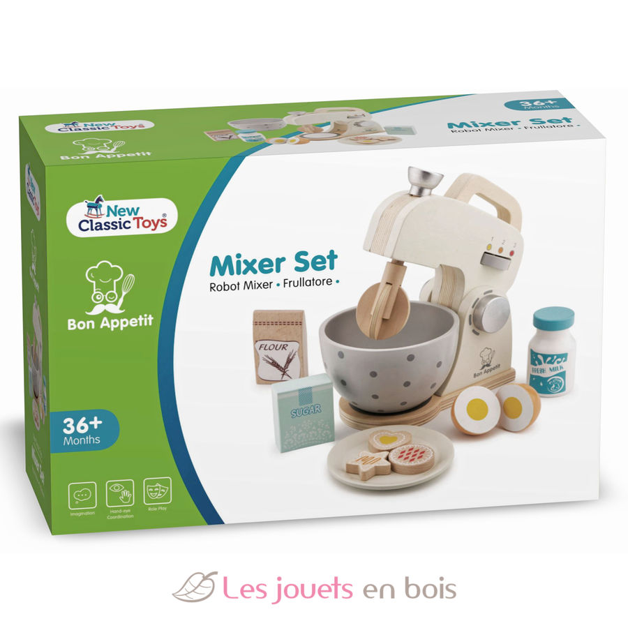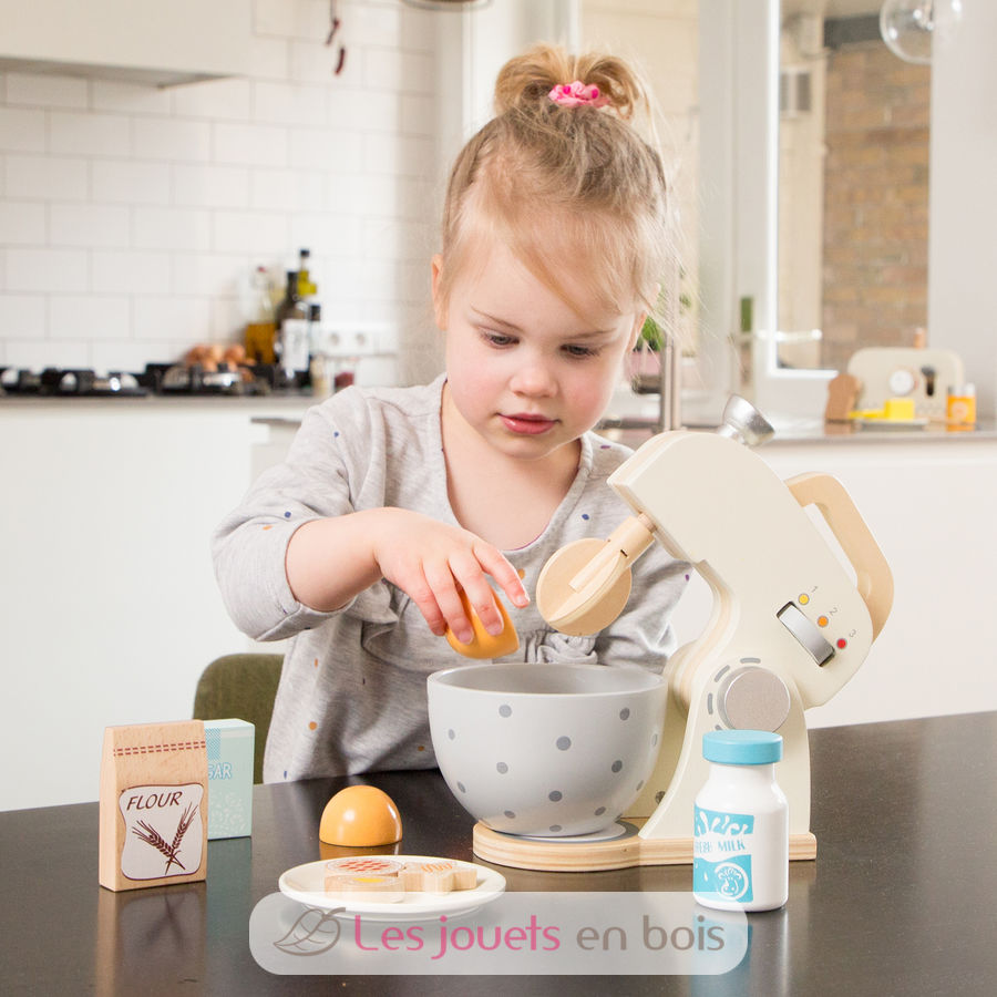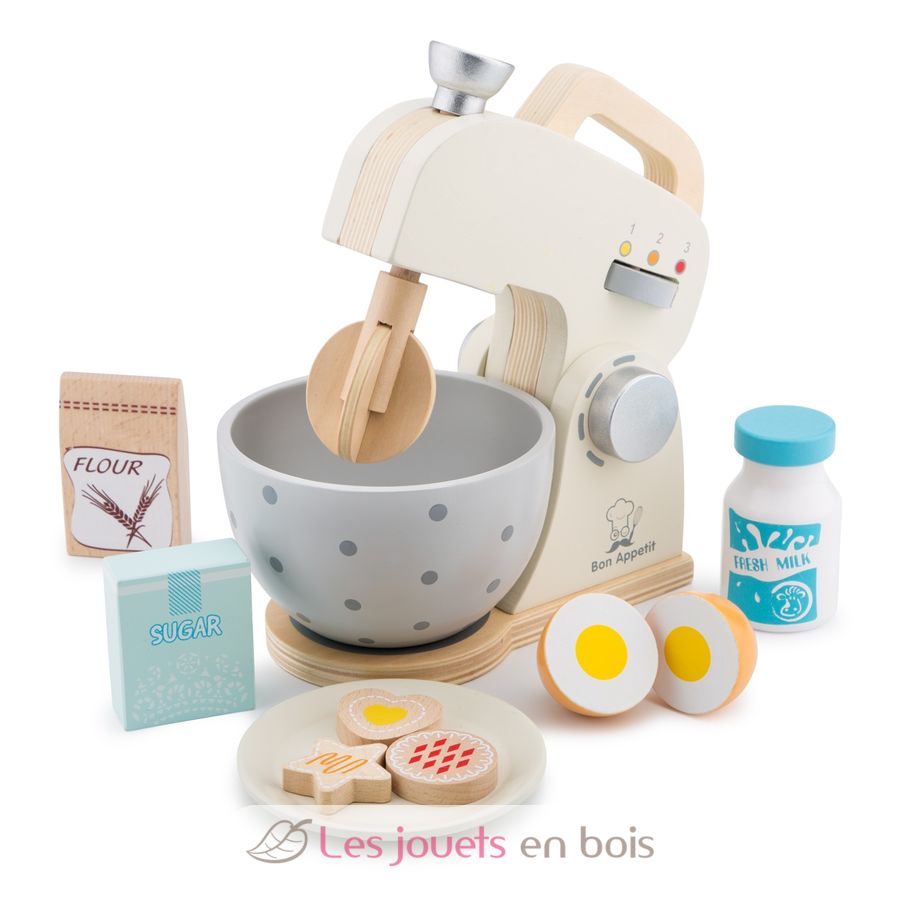 Tus hijos podrán preparar deliciosos pasteles gracias a esta batidora de madera con brazo móvil y giratorio. El brazo de esta batidora se acciona de abajo arriba y el mango de la parte superior se utiliza para batir los ingredientes. Un excelente robot de cocina para niños que viene con un bol extraíble, un paquete de azúcar, un paquete de harina, una botella de leche, un plato de galletas y un huevo. ¡Tus hijos se lo pasarán bomba cortando, mezclando y sirviendo sus preparaciones con este set de pastelería! Set con batidor de madera para hacer tartas, un juguete de la marca New Classic Toys. Referencia 10707.