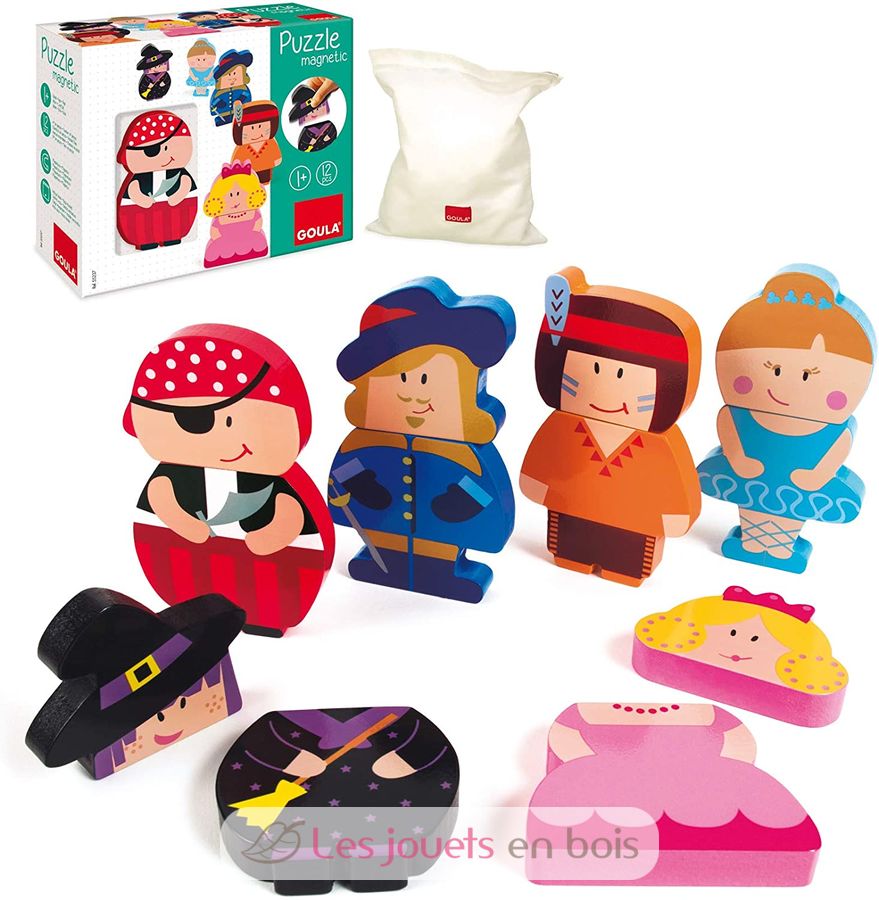 Estos sencillos rompecabezas ayudan a desarrollar la motricidad y la agilidad. Su hijo aprenderá a captar las piezas, a asociarlas y a componer así varios personajes con dos piezas (pirata, indio, mosquetero, princesa). Estos rompecabezas magnéticos de madera con personajes son un juguete ideal. Un juguete de madera de la marca Goula.