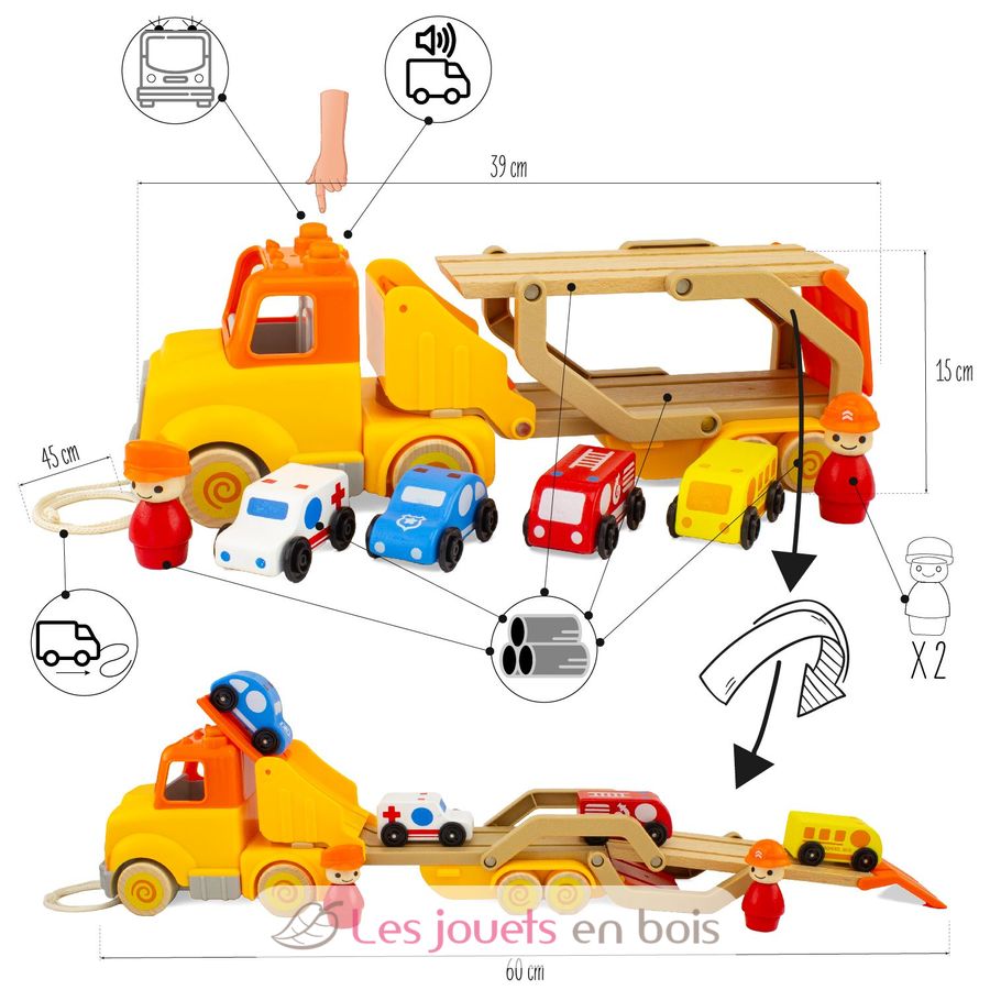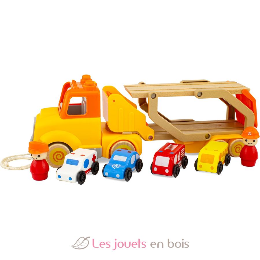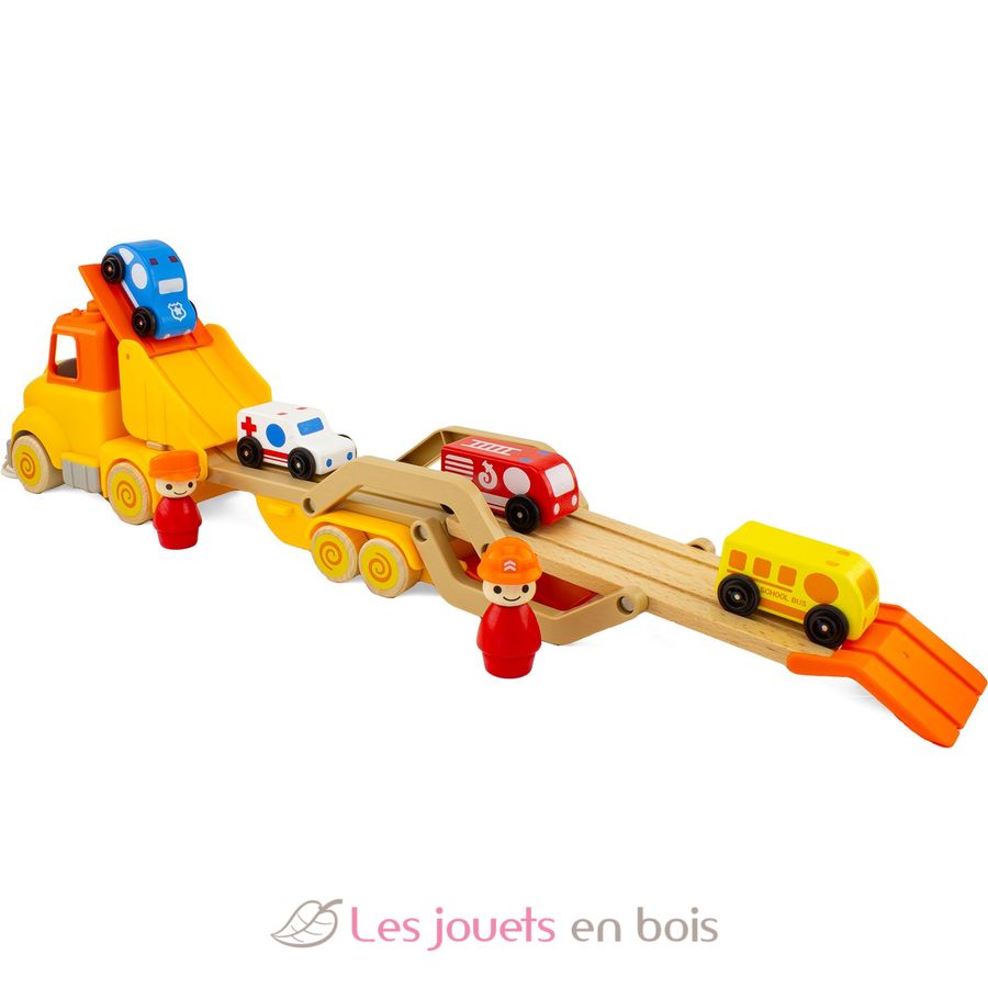 Este camión viene con 2 personajes extraíbles y 4 coches de madera, lo que ofrece multitud de escenarios de juego para el niño.
