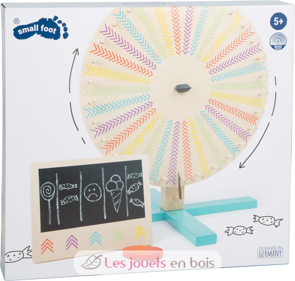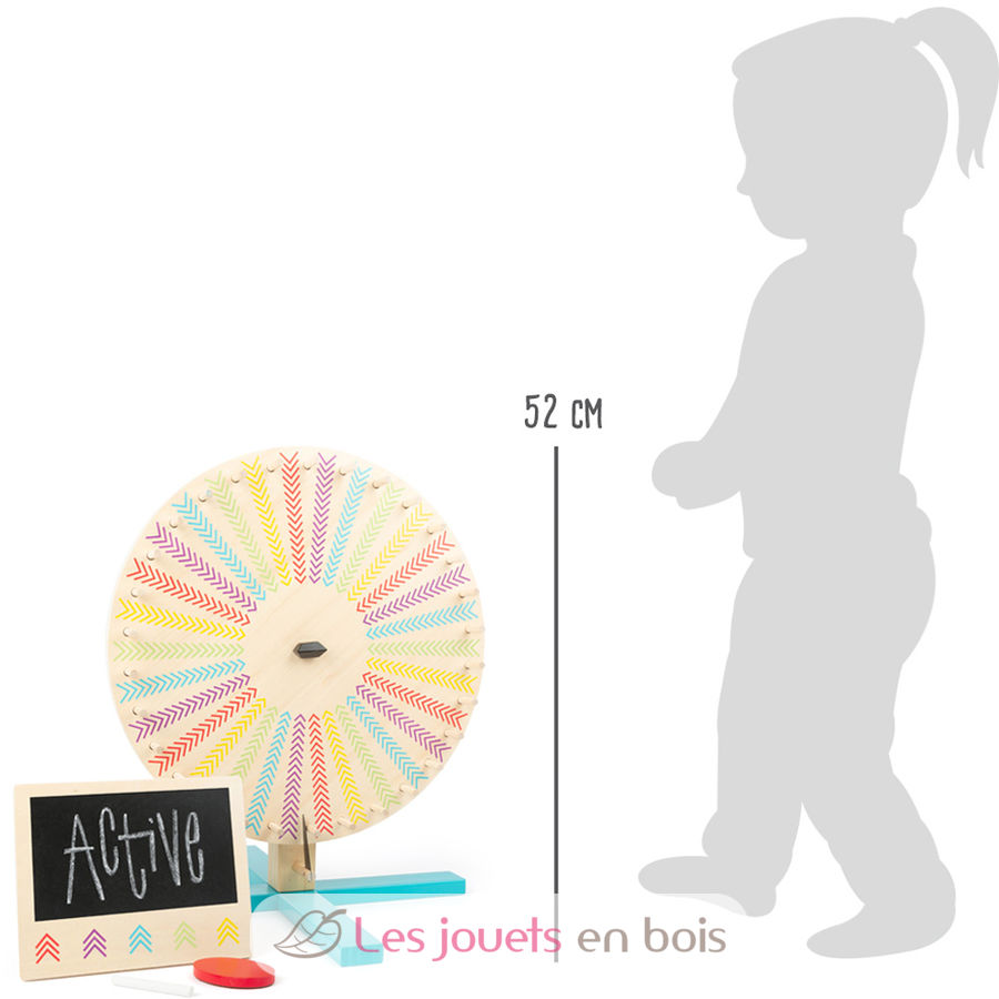 ¡Todos los giros ganan! Esta rueda de la fortuna está equipada con una plataforma giratoria reversible fácil de reajustar. El disco tiene 30 campos de color en un lado y pintura de paneles en el otro, esto significa que siempre se puede crear una nueva clasificación. En el tablero pequeño anotas los equipos o nombres con sus puntos, para que al final puedas elegir el ganador.