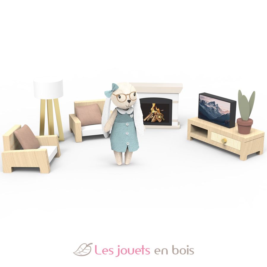 Adéntrate en un mundo de imaginación con este conjunto de accesorios de madera para la sala de estar de la casa de muñecas, que incluye un pequeño conejo de tela (10cm).