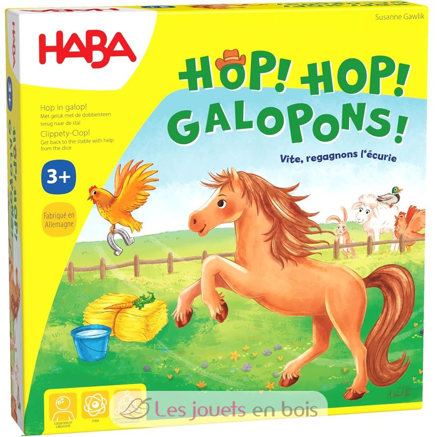 Galopa para recuperar 7 accesorios útiles para su caballo y llevarlo de vuelta a su establo primero. Este juego fomenta la observación y la toma de decisiones, la comprensión de una primera regla del juego. De 2 a 4 jugadores. Edades de 3 a 8 años.