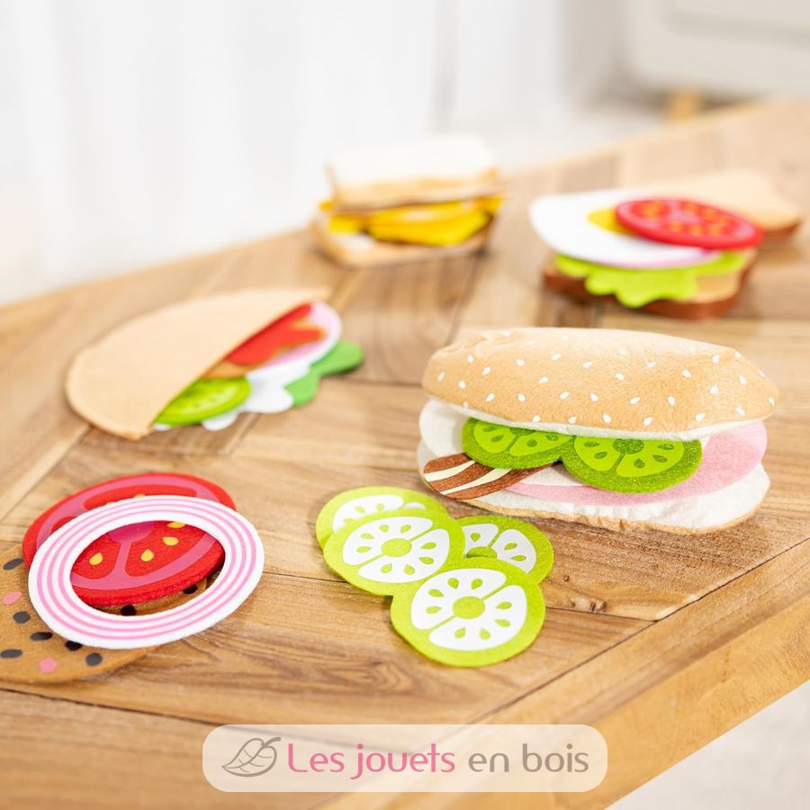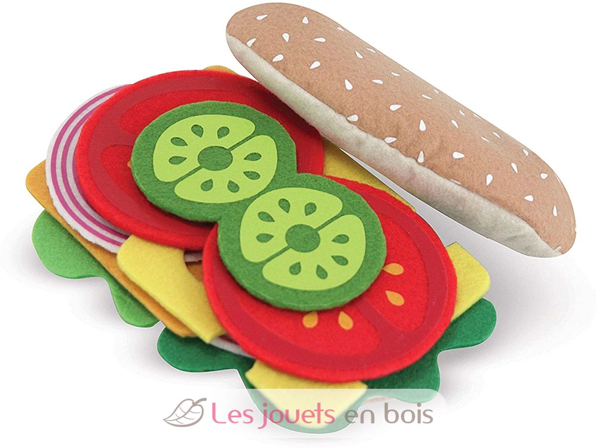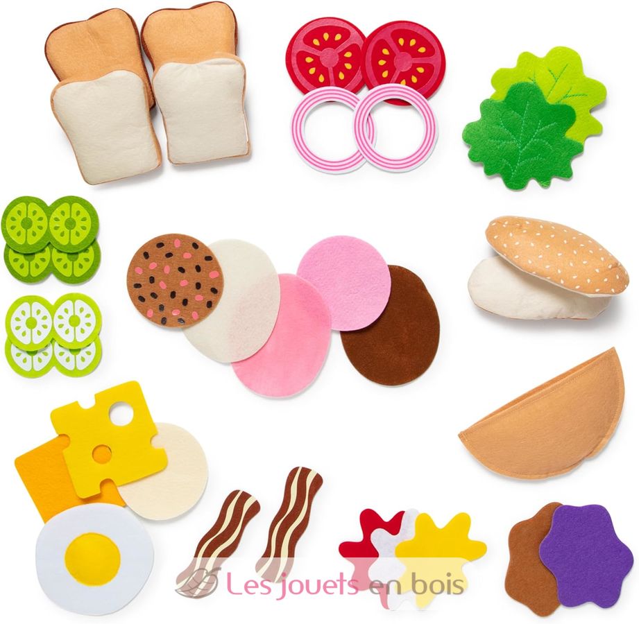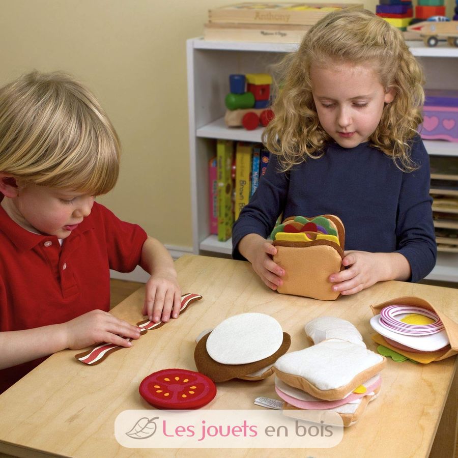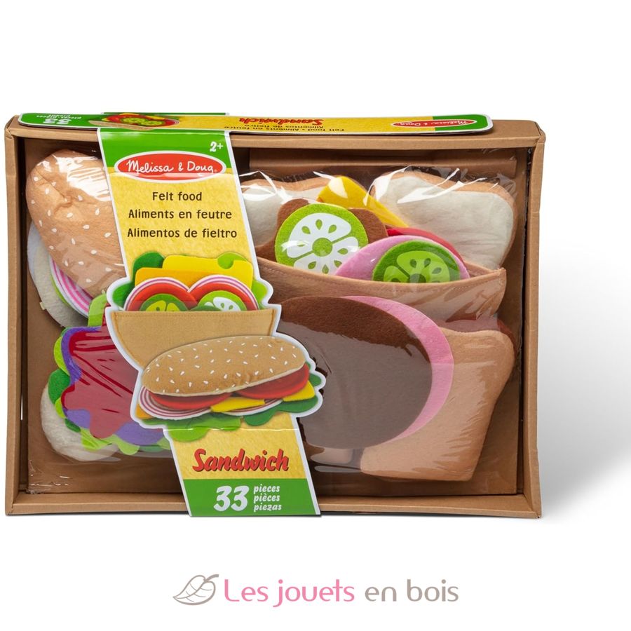 Abre tu propia tienda de sándwiches con este set de 33 piezas de comida de fieltro fabulosas! Utiliza rebanadas de pan blanco o de trigo o una pita , luego pon capas de carnes, quesos, verduras , condimentos y más . Tenemos los ingredientes para un pedido especial. Actividades adicionales: Más formas de jugar y aprender: - Haz que el niño identifique cada alimento y lo clasifique en los grupos básicos de alimentos: carne, lácteos, cereales, frutas o verduras. - Haz turnos para ser chef y representante de atención al cliente en un restaurante. Haz un "pedido" de un sándwich con varios ingredientes. Pídale al niño que arme su orden utilizando la memoria auditiva. Discutir qué tipos de sándwiches suelen ser más apropiados para el desayuno, la comida o la cena. - Pide al niño que identifique los colores y las formas evidentes de cada alimento. - Coloca todas las piezas de comida de fieltro en una fila. Cuenta el número de piezas. Repite la operación hasta que el niño sea capaz de contarlos de forma autónoma. - Habilidades de memoria visual: Coloque 3-4 ingredientes delante del niño. Deje que el niño las estudie antes de pedirle que cierre los ojos mientras usted retira una sola pieza. Pregúntale al niño cuál se ha quitado. Aumente gradualmente el número de ingredientes. Juegos premiados: Holiday Gift Guide Top Picks 2011 y FamilyFun Magazine: FamilyFun Toy of the Year (TOY ) Awards 2011 Melissa and Doug Ref: 13954