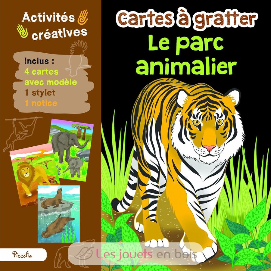 Esta caja incluye 4 tarjetas rasca y gana con modelo, 1 stylus y 1 instructivo. ¡El conjunto es muy colorido con ilustraciones del parque de animales!