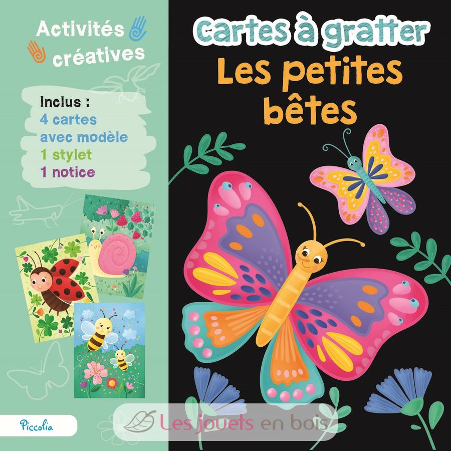 Esta técnica de rascado permite trabajar la motricidad fina de los niños mientras se divierten y hacen hermosas composiciones. El principio: Con la ayuda de un estilete de madera, el niño rasca suavemente los soportes en los lugares indicados para revelar nuevos colores o ilustraciones, igual que si estuviera sosteniendo un bolígrafo.