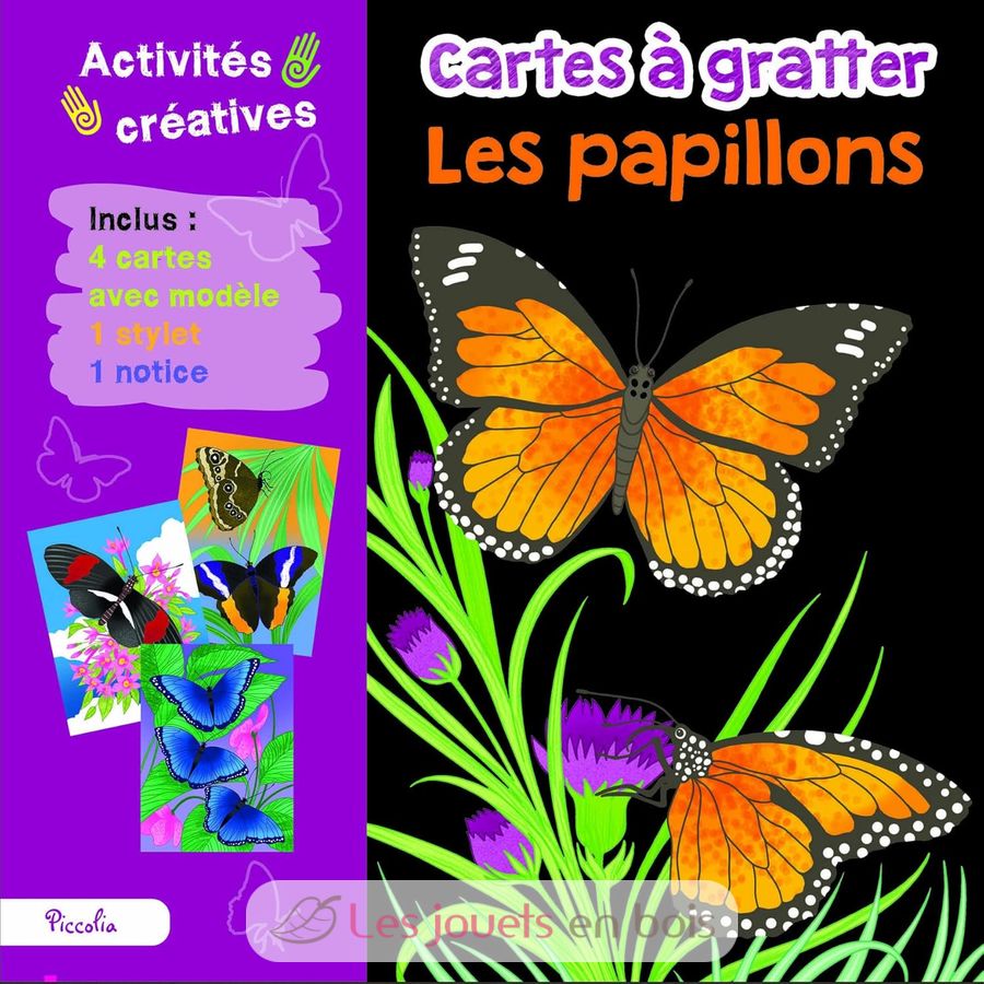 Esta caja incluye 4 tarjetas rasca y gana con modelo, 1 stylus y 1 instructivo. ¡El conjunto es muy colorido con ilustraciones de mariposas!