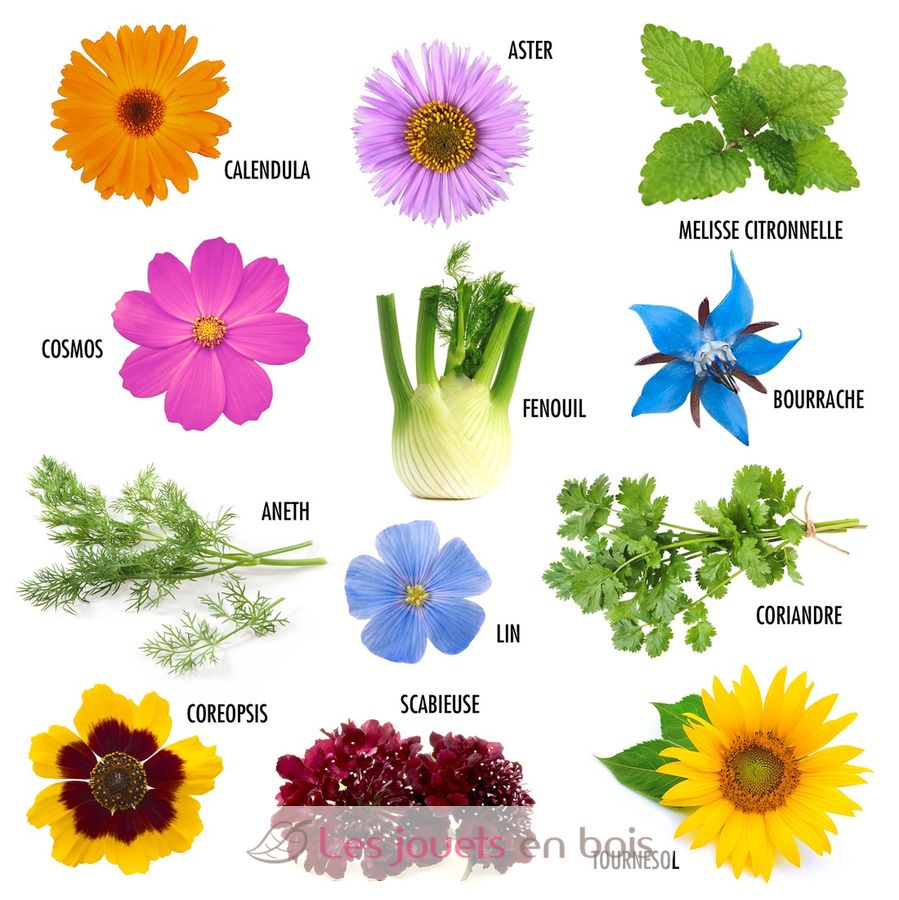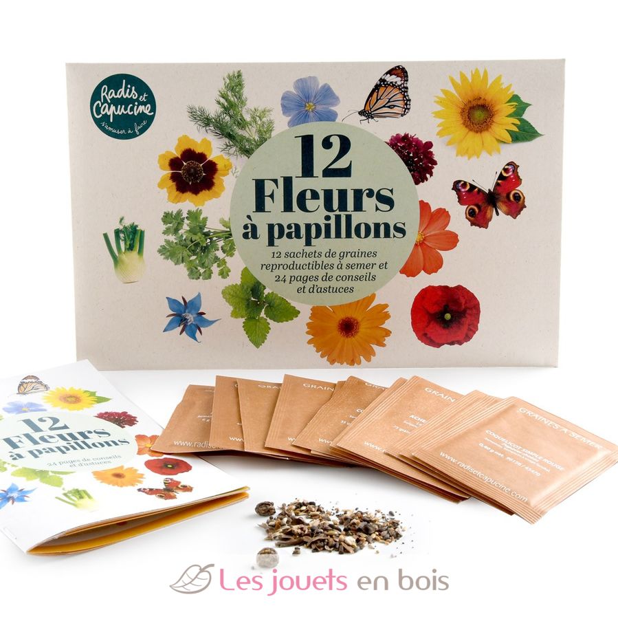 Este kit de jardinería contiene 12 paquetes de semillas y un folleto de 24 páginas escrito en francés por un jardinero experto que te guiará paso a paso en el proceso de cultivo.