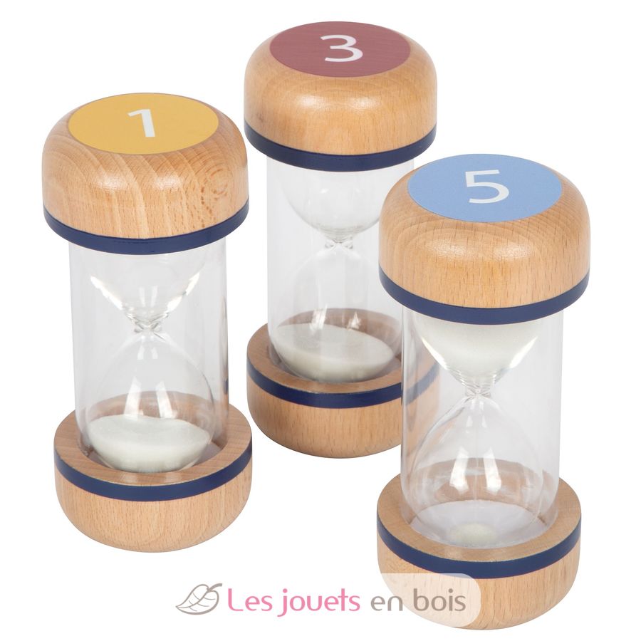 El set de 3 relojes de arena fabricado en robusta madera de haya (1, 3 y 5 minutos), es una gran ayuda para que los niños de jardín de infancia, primaria y preescolar "vean" el tiempo.