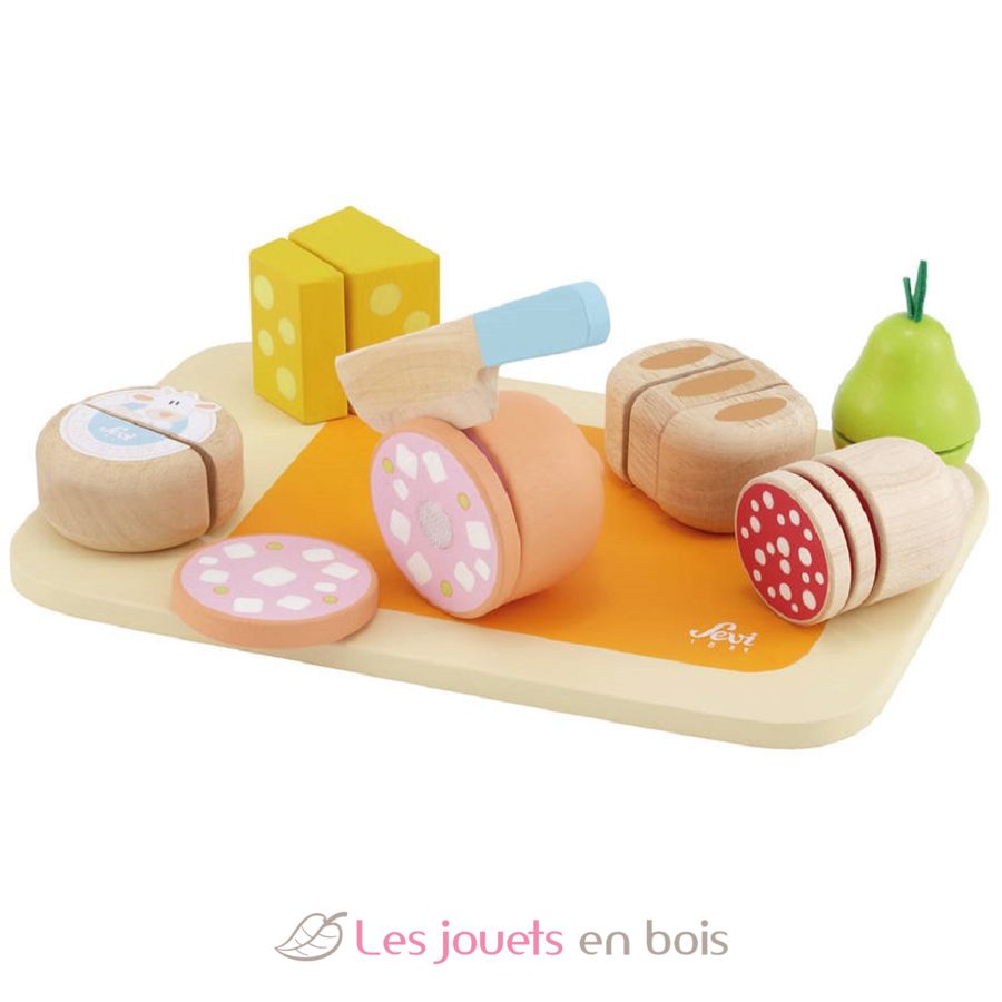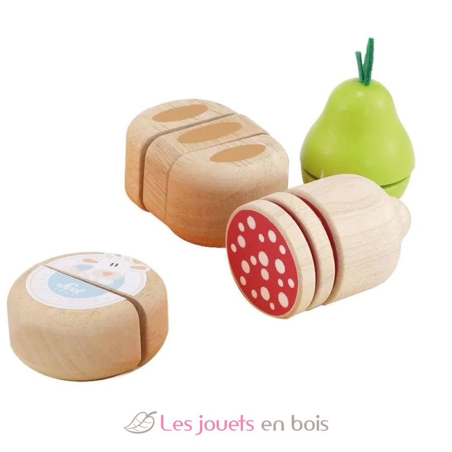 Aquí tienes una tabla de cortar de madera que permite a los niños divertirse preparando un delicioso aperitivo con pan, queso y salami. Cada pieza de comida consta de rebanadas unidas con velcro y fácilmente desmontables con el cuchillo de madera de juguete incluido.