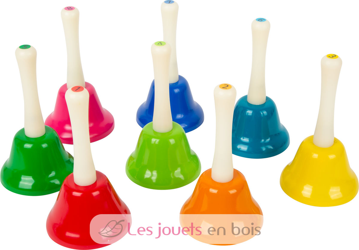 ¡Es hora de un poco de dulzura para los oídos! Las ocho campanas, codificadas en color y pegatinas con notas, están afinadas cada una con las notas Do, Re, Mi, Fa, Sol, La, La, La, Do. Además, lleva una partitura con ocho canciones diferentes y son adecuadas para los pequeños músicos principiantes, ya que las notas se muestran en diferentes colores. Un set de música que promueve las habilidades rítmicas y acústicas, así como la coordinación física.