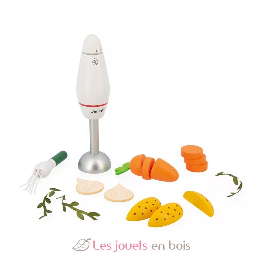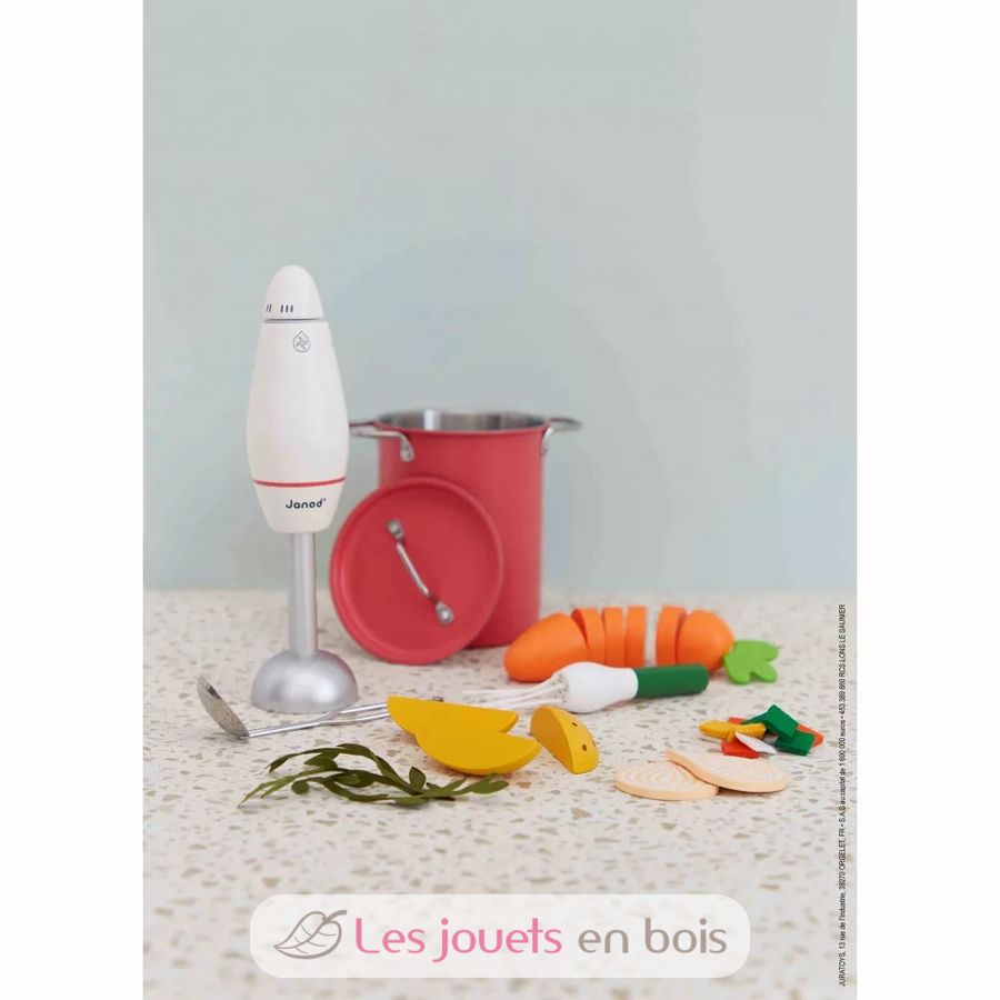 ¡A cocinar se ha dicho! ¡Solo hay que dar rienda suelta a su imaginación y ponerse manos a la obra con la olla de metal con tapa, el cucharón y hasta una batidora para hacer crema o puré de verduras! Con todos estos accesorios tan realistas, este juego permitirá al peque inventarse ricos platos y hacer como los mayores disfrutando de un buen rato juntos en torno a una deliciosa comida. .