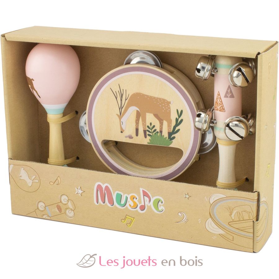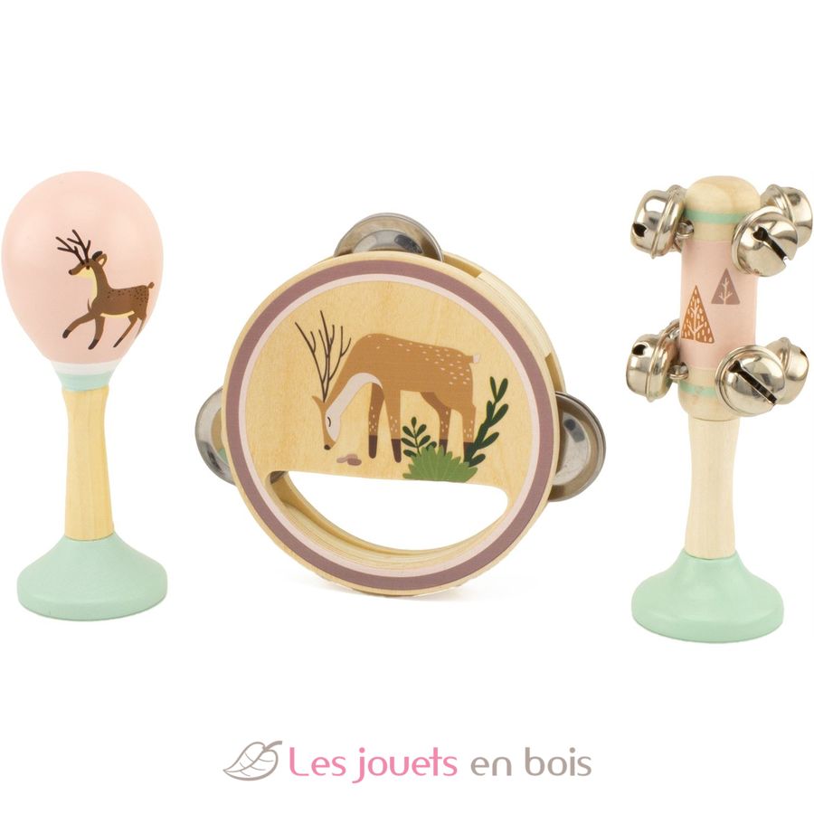Introduce a los más pequeños en la música con este set musical de madera compuesto por tres instrumentos: una maracas, una pandereta y un palo con ocho cascabeles de metal. La pandereta está fabricada íntegramente en madera con mango ergonómico y tres sonajas para crear divertidos efectos sonoros.