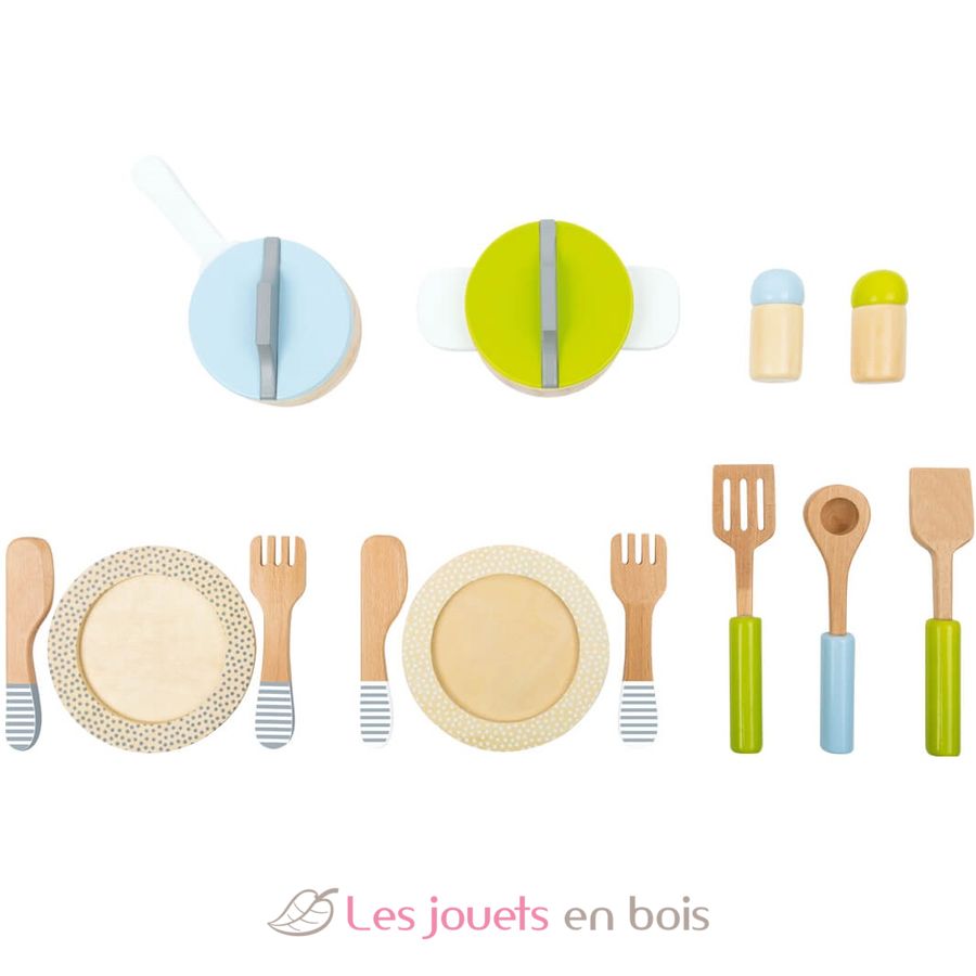 Este vajilla para 2 personas incluye 13 accesorios de madera: 1 olla grande con tapa, 1 olla pequeña con tapa, 1 cuchara medidora, 2 espátulas, 2 platos, 2 tenedores, 2 cuchillos, 2 contenedores de especias.