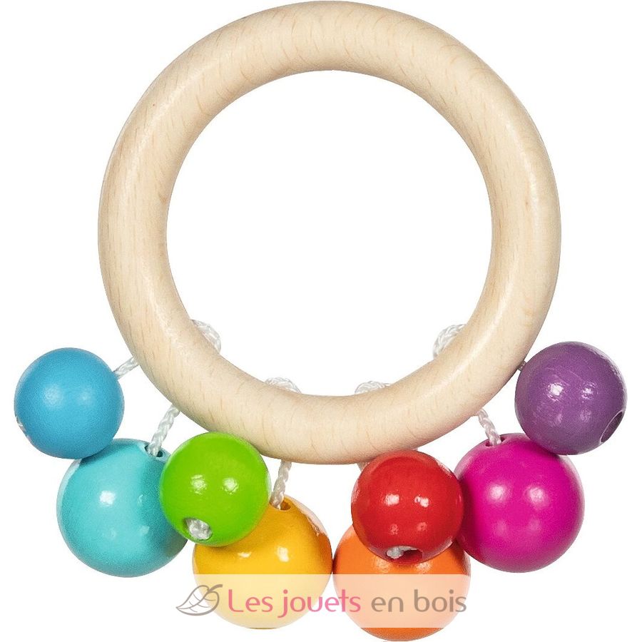 Sonajero anilla con 8 perlas arcoíris, un sonajero de madera fabricado en Alemania por Goki. Artículo número 65363.