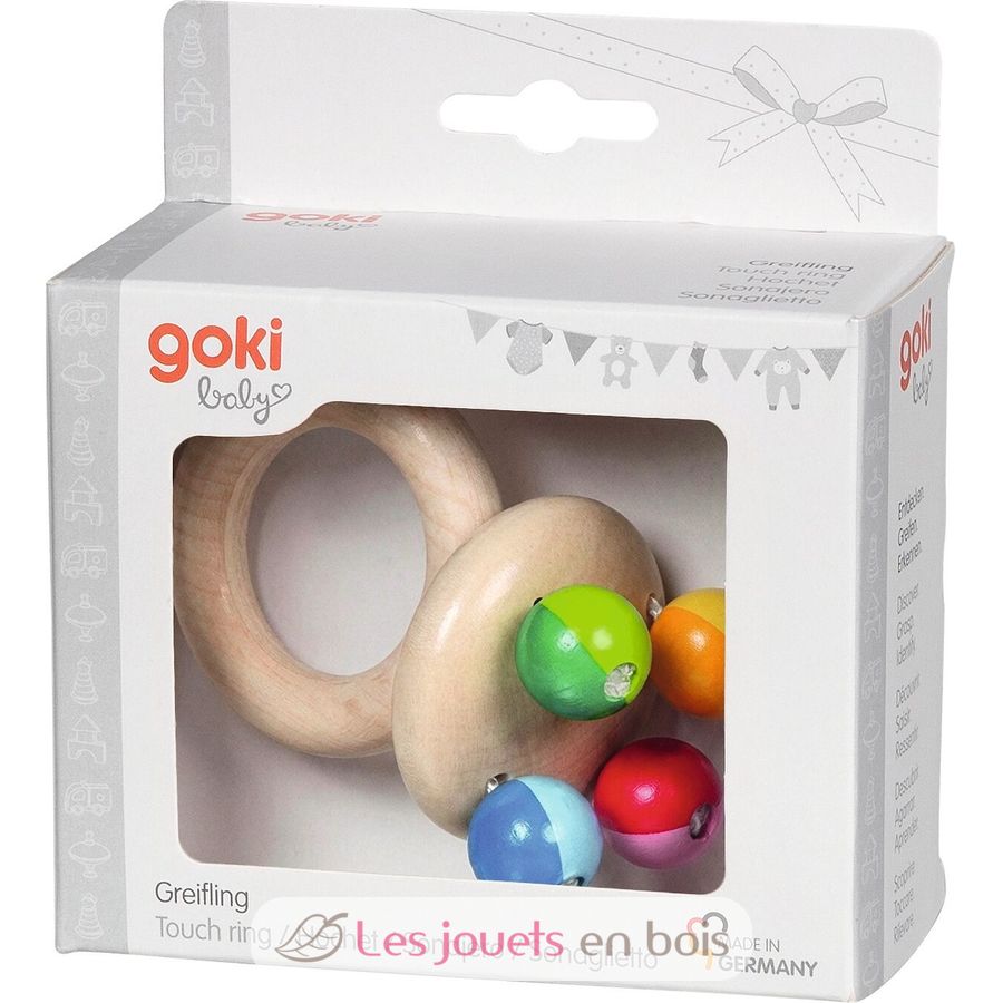 Sonajero arcoíris, un sonajero de madera fabricado en Alemania por Goki. Artículo número 65350.