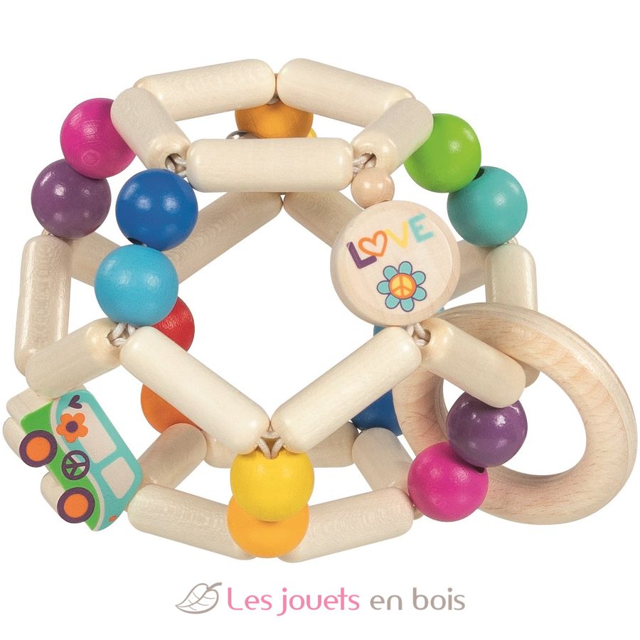 Sonajero elástico pelota furgoneta arcoíris, un sonajero de madera fabricado en Alemania por Goki. Artículo número 65361.