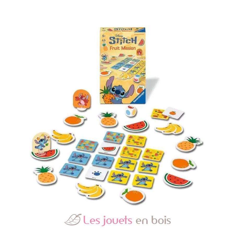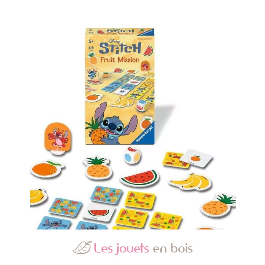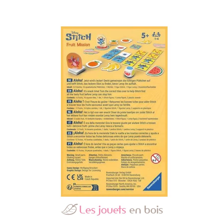 Contenido: 12 frutas, 16 tarjetas cuadradas, 1 dado, 1 figura de Stitch y 1 figura de Leroy con sus soportes de plástico, 1 reglamento.