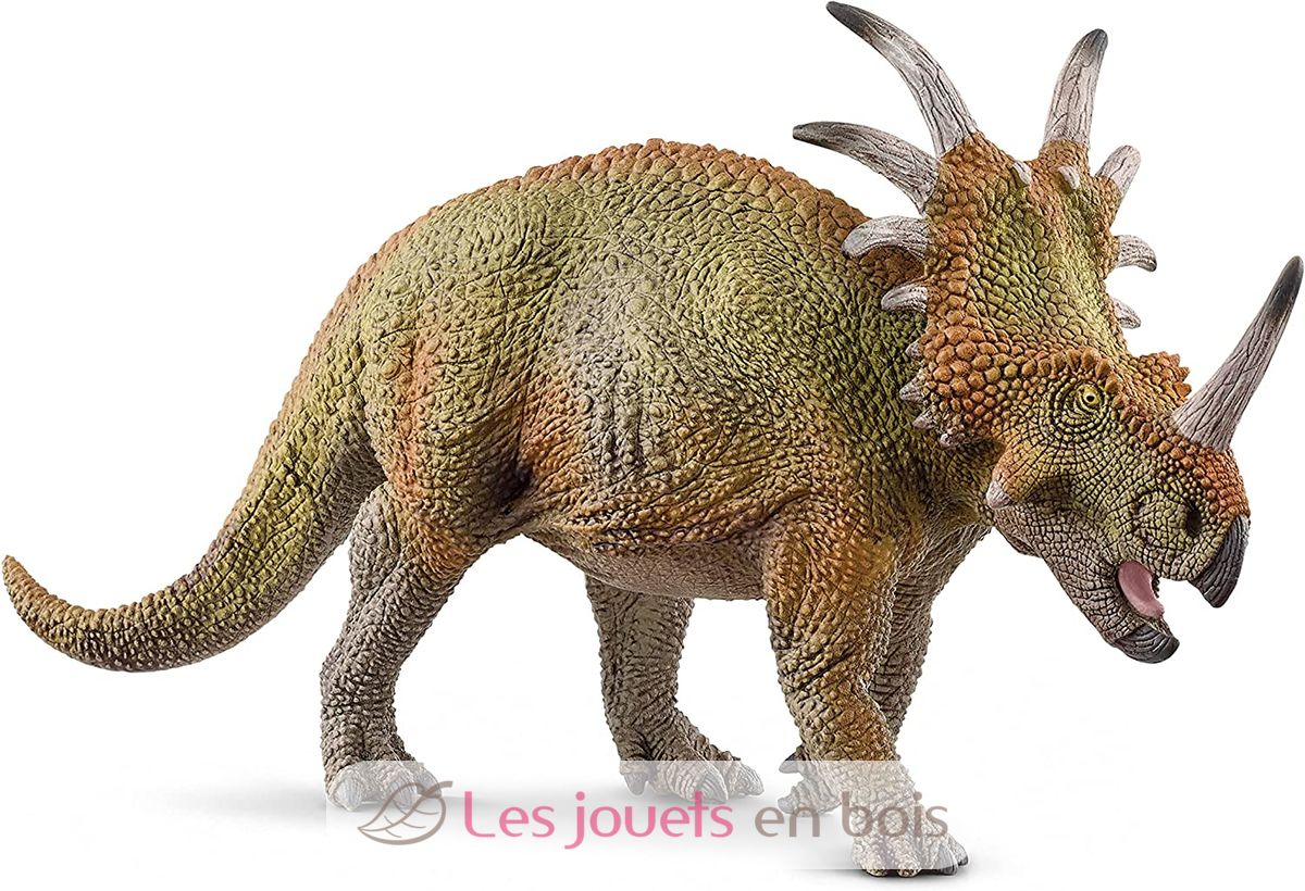 El Styracosaurus tenía un gran volante salpicado de seis cuernos largos, así como dos cuernos sobre los ojos y uno en el hocico. Menos alto que el triceratops, pesaba unas 3 toneladas y medía hasta 5,5 metros de largo.