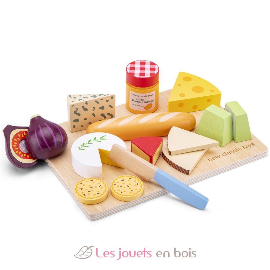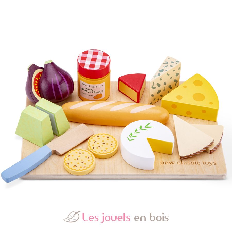 Este juego incluye una tabla de cortar, un cuchillo de juguete, una baguette, 2 galletas saladas, un higo, un trozo de queso brie, un trozo de queso Gouda, un trozo de queso suizo, un trozo de queso azul, dos rebanadas de queso manchego, 2 trozos de queso Valençay y un tarro de chutney de mango afrutado.