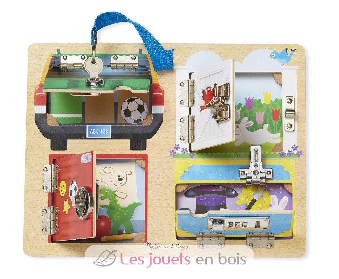 El tablero de cerraduras y candados, un juguete educativo de madera de la famosa marca americana Melissa & Doug. Ref: 19540.
