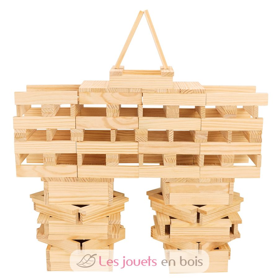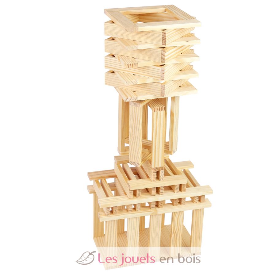 Juego de construcción compuesto por 200 tablillas de madera natural, fabricado en Francia.